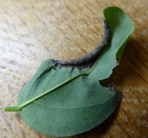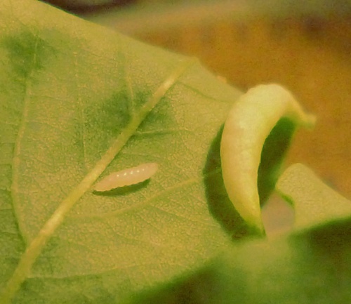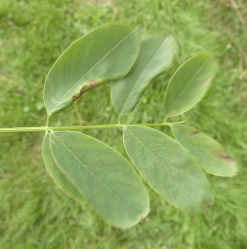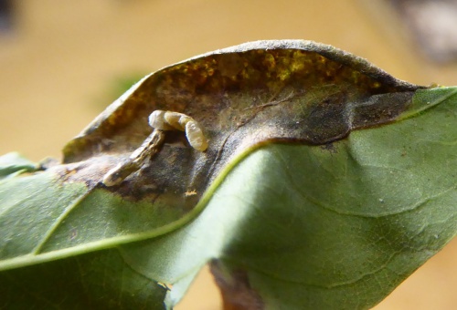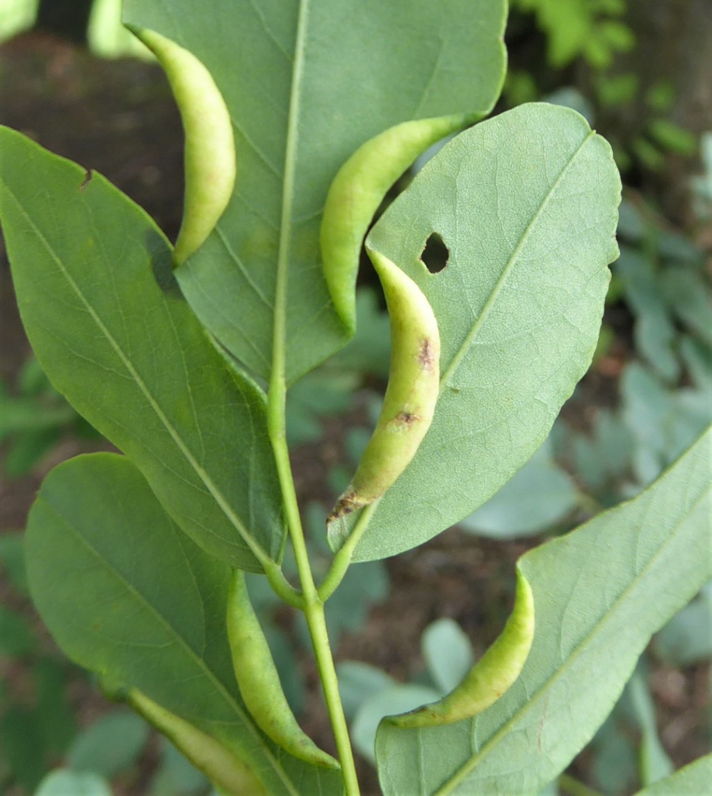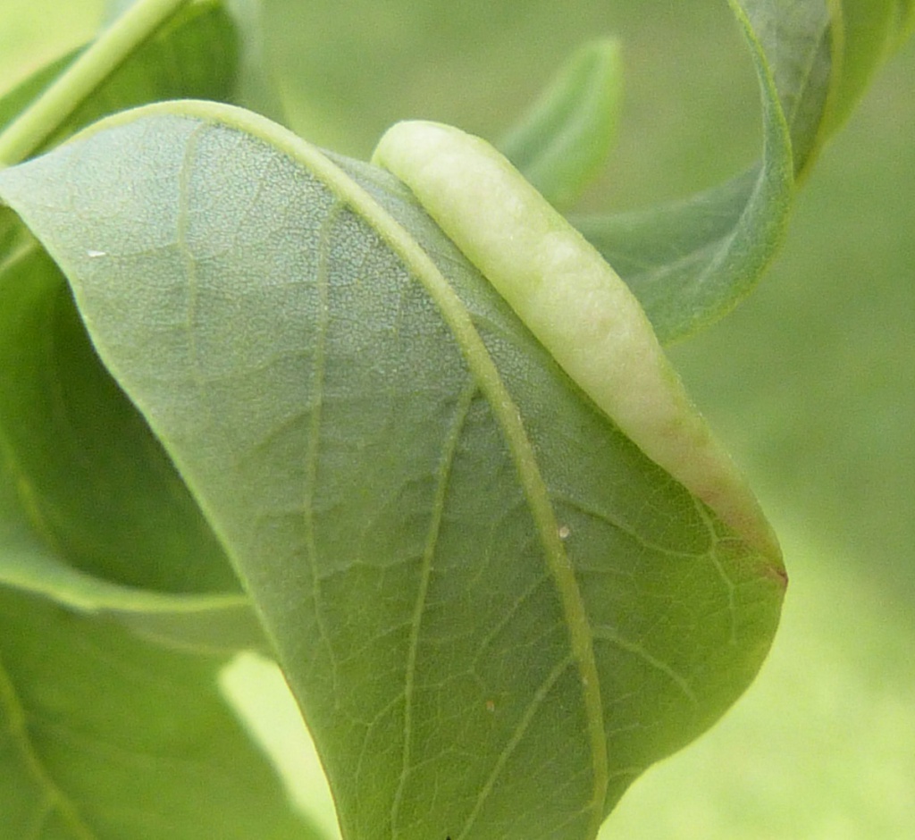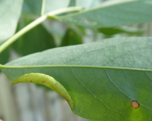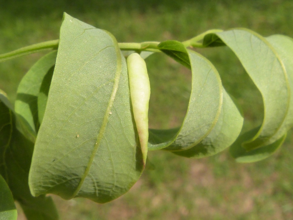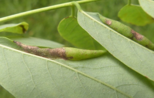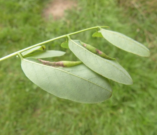 The tiny white larvae of the midge Obolodiplosis robiniae mine the leaves of the introduced False Acacia or Black Locust Tree (Robinia pseudoacacia) causing the edge of the leaflet to roll downwards and thicken. Each roll may contain several white or yellowish larvae.