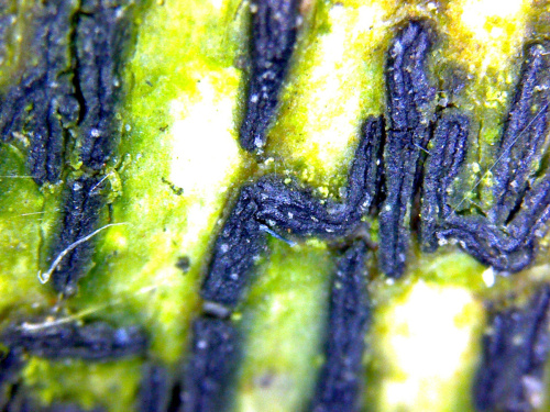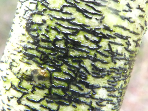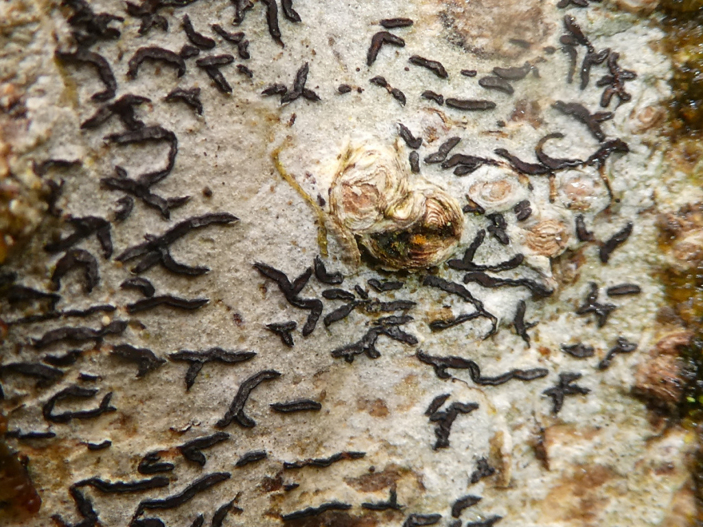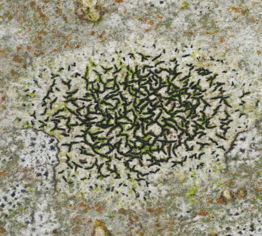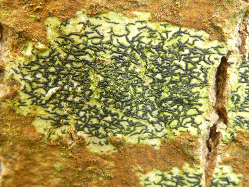 Whitish or green-grey thallus, the short (1 mm), prominent lirellae with black looking central slit often densely crowded at centre of thallus.