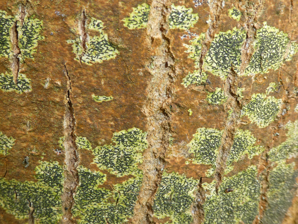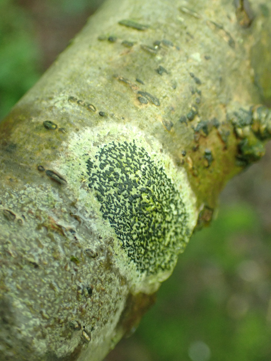Common on the trunks, branches and twigs of trees with smooth shaded bark, rarely found on fences. Forms extensive mosaics on young trees but tends to avoid nutrient-enriched bark.