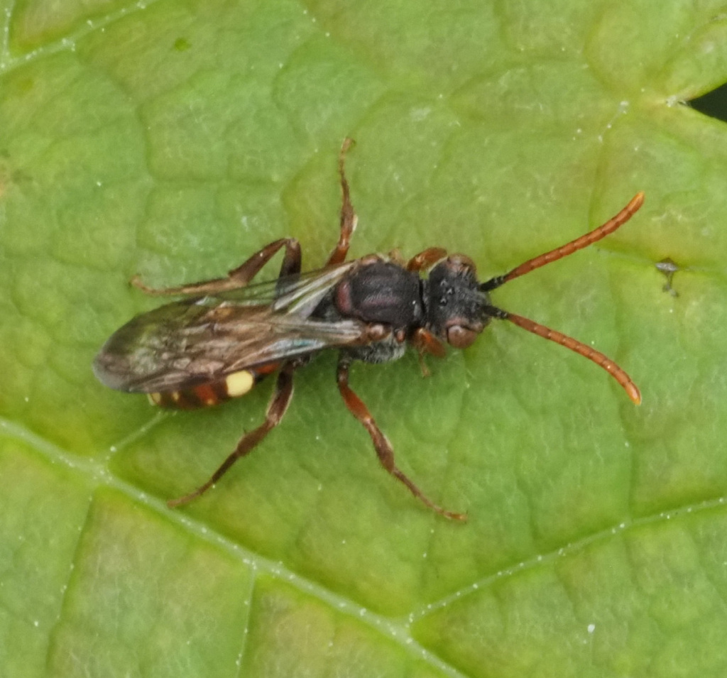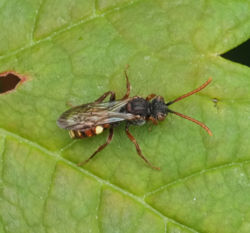 A medium-sized red, black and yellow nomad bee that closely resembles N. flava. Females are generally darker looking, with darker wing margins, plus silvery (rather than yellowish) hairs on the propodeum, hind coxae and sides of the thorax. The antennae are slightly shorter, and the outstanding bristly hairs on the face are blackish rather than yellowish. The hind face of the propodeum is often extensively red-marked. Males average smaller and darker-looking than flava. The fringe of hairs beneath the mid femora is longer - about as long as the greatest width of the femur (only half as long in flava) but some males are very difficult to separate.