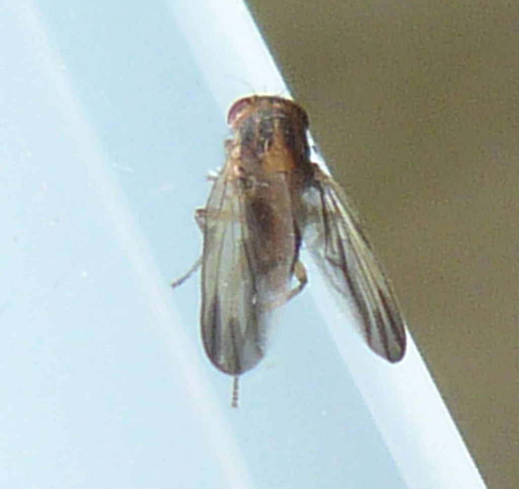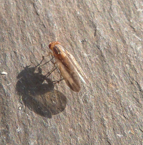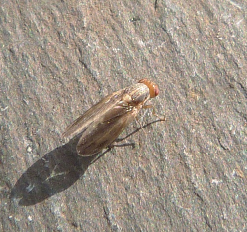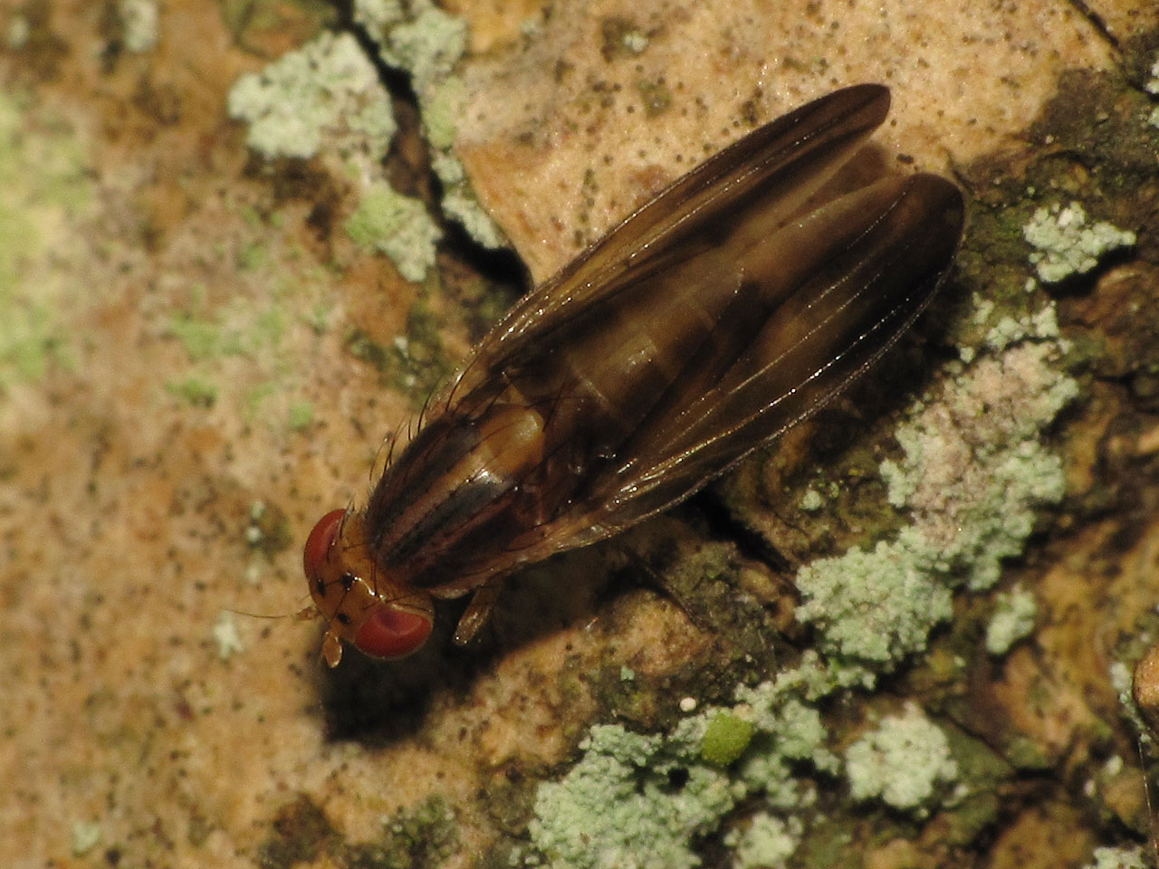 Length 5 mm. A handsome little fly of an overall orangey brown appearance, but with striped thorax, banded eyes and large dark shaded areas on the wings.