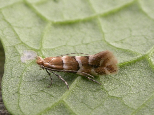 Wingspan 9 to 10 mm. This is one of several similar looking species but can be identified with care. The larva mines the leaves of Honeysuckle, Snowberry and Himalayan Honeysuckle (Leycesteria formosa) causing a large tentiform mine. The pupa is in a brown cocoon and has a distinctive flat pupal cremaster, with two very short spikes.