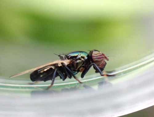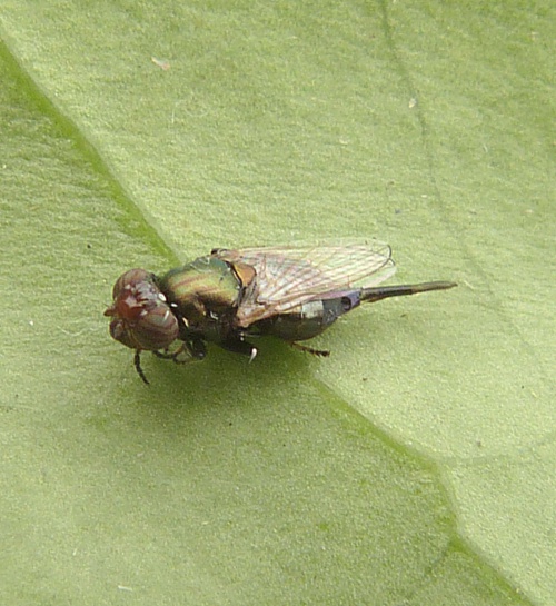 One of two clear-winged Ulidiids in Britain (the other is Ulidia erythrophthalma). Physiphora alceae usually has a metallic-green thorax, concave face profile and pale fore tarsi. The eyes can appear green and purple-banded in live specimens.