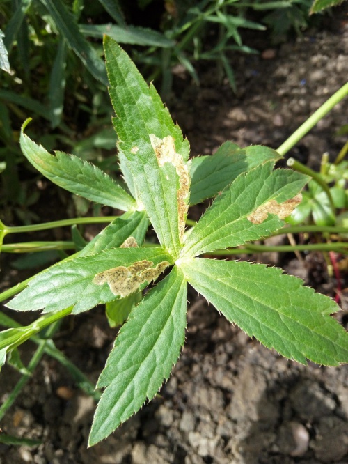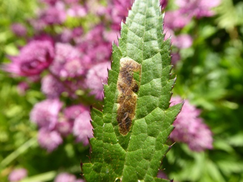 The larvae of the fly Phytomyza astrantiae mine the leaves of Masterwort (Astrantia major). The mine is a gallery/blotch, brown in colour with a pale yellow margin.