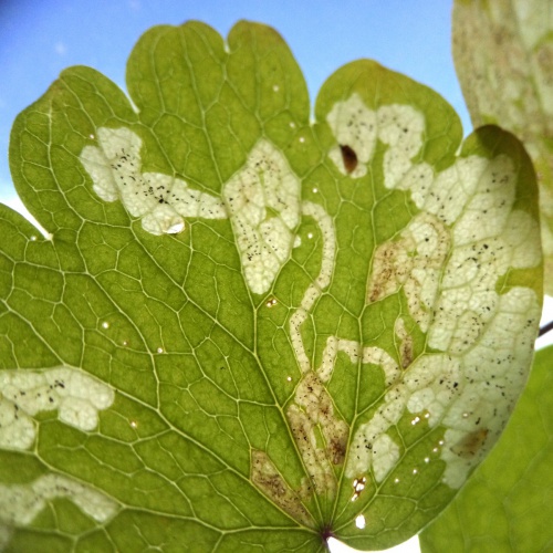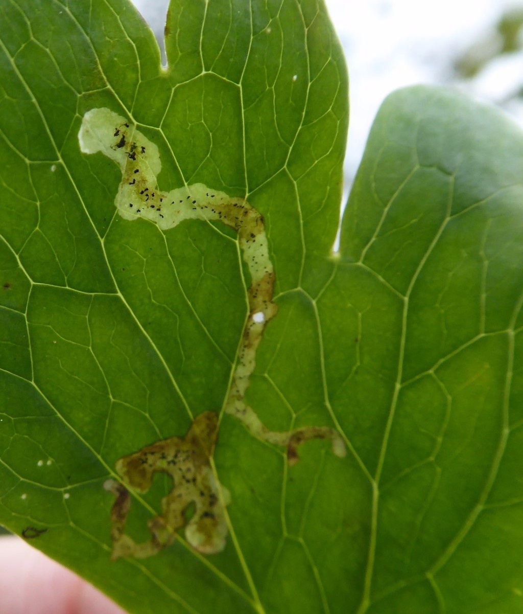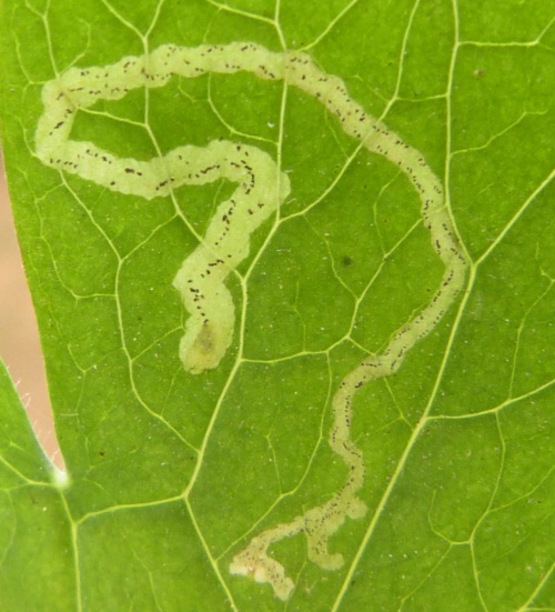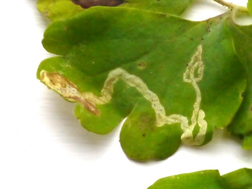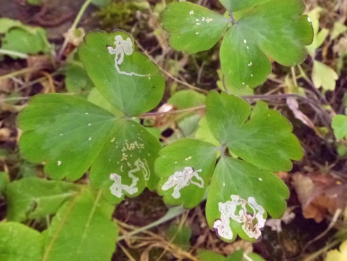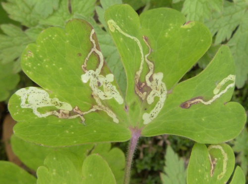 This is a small grey/black fly whose larvae mine the leaves of several plants, but especially Aquilegias, forming a white, linear corridor which may then form a secondary blotch. There are often several mines per leaf.