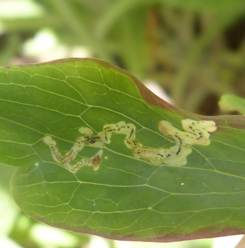 Pupation external, normally adhering to the leaf near the end of the mine until dislodged by rain or wind.