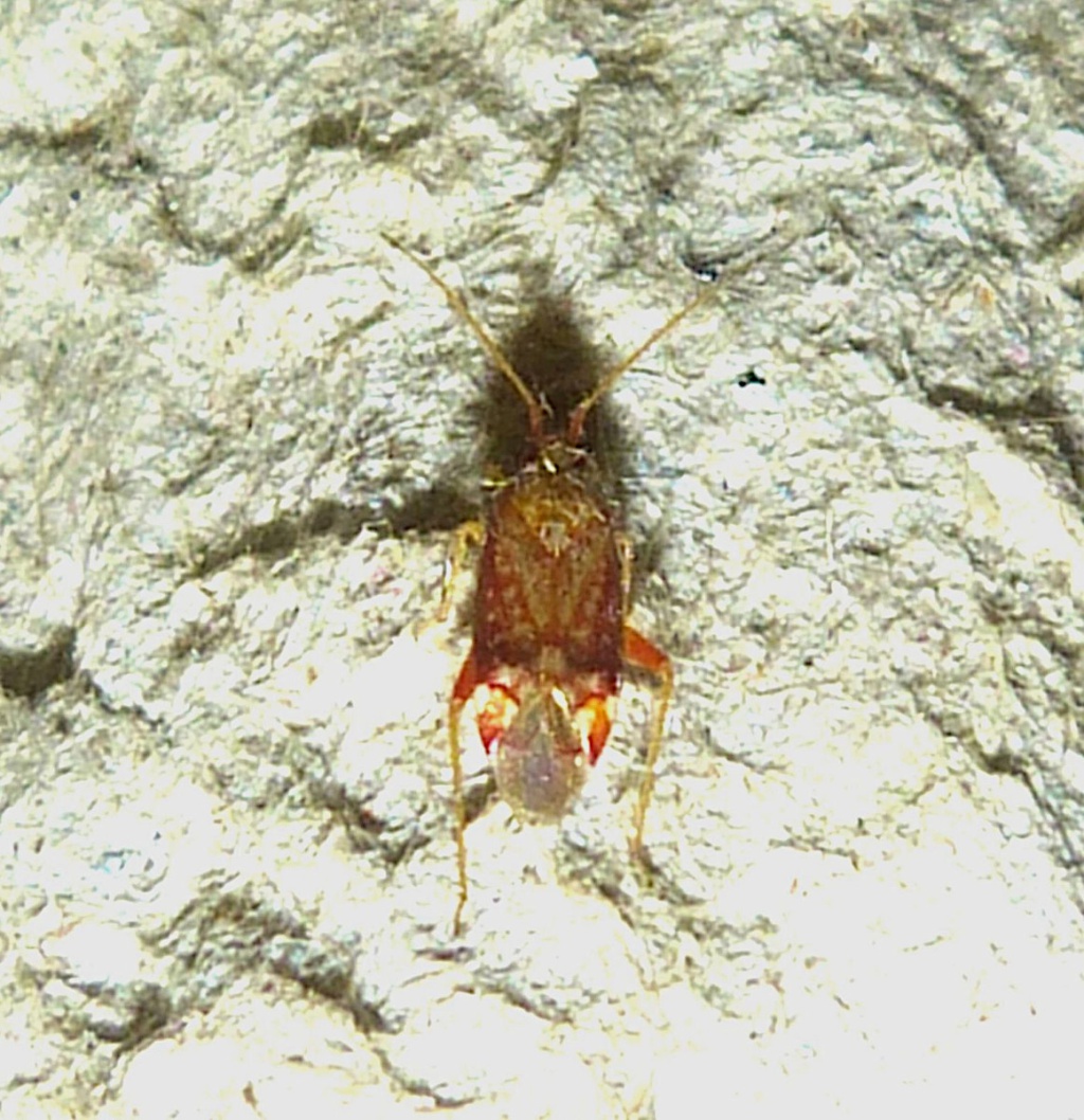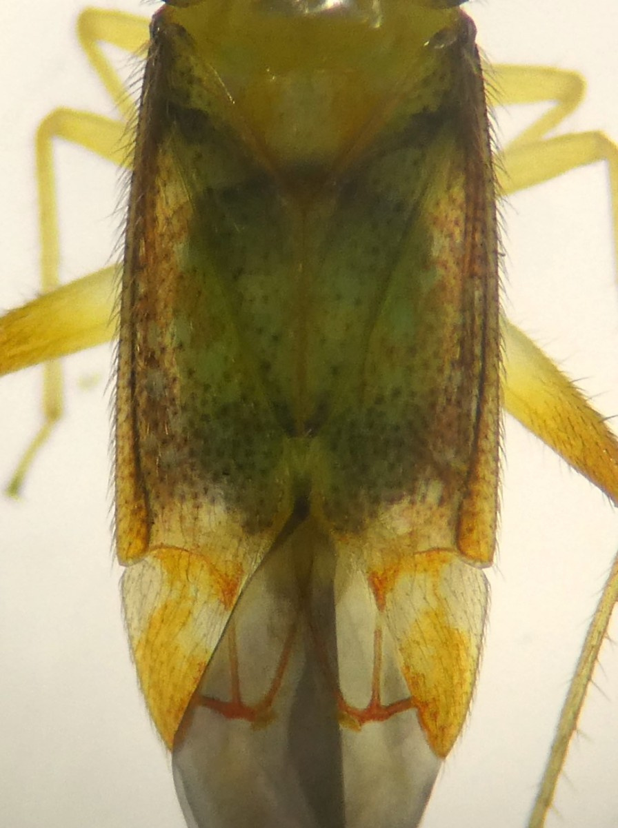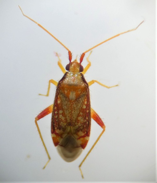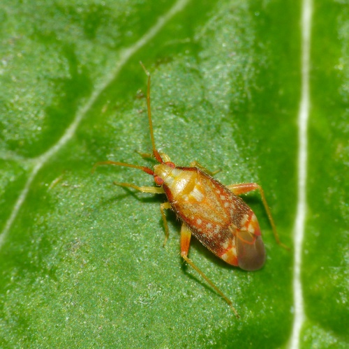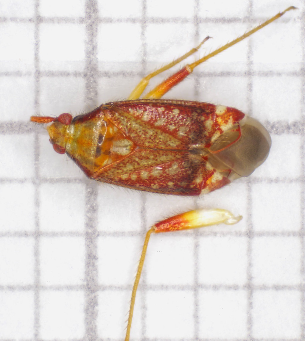 Length 4.5 mm. This species is distinctively coloured and the forewings are mottled orange and red. The 1st antennal segment is red and covered in dark hairs. The wing membrane veins and the sides of the pronotum are also marked with red.