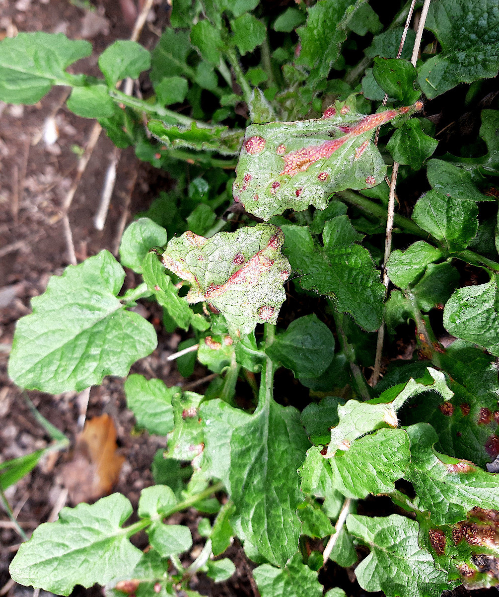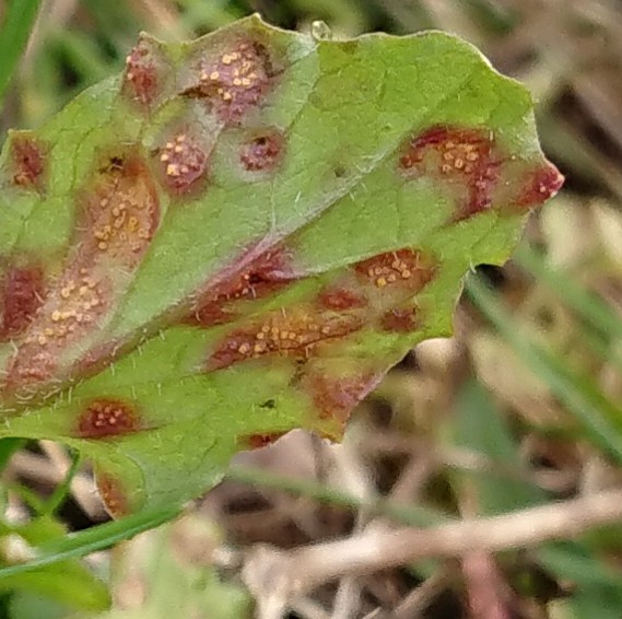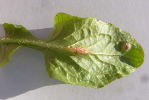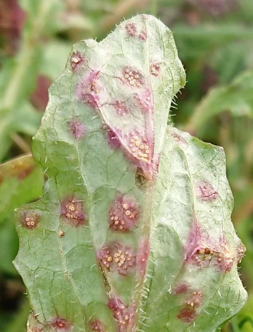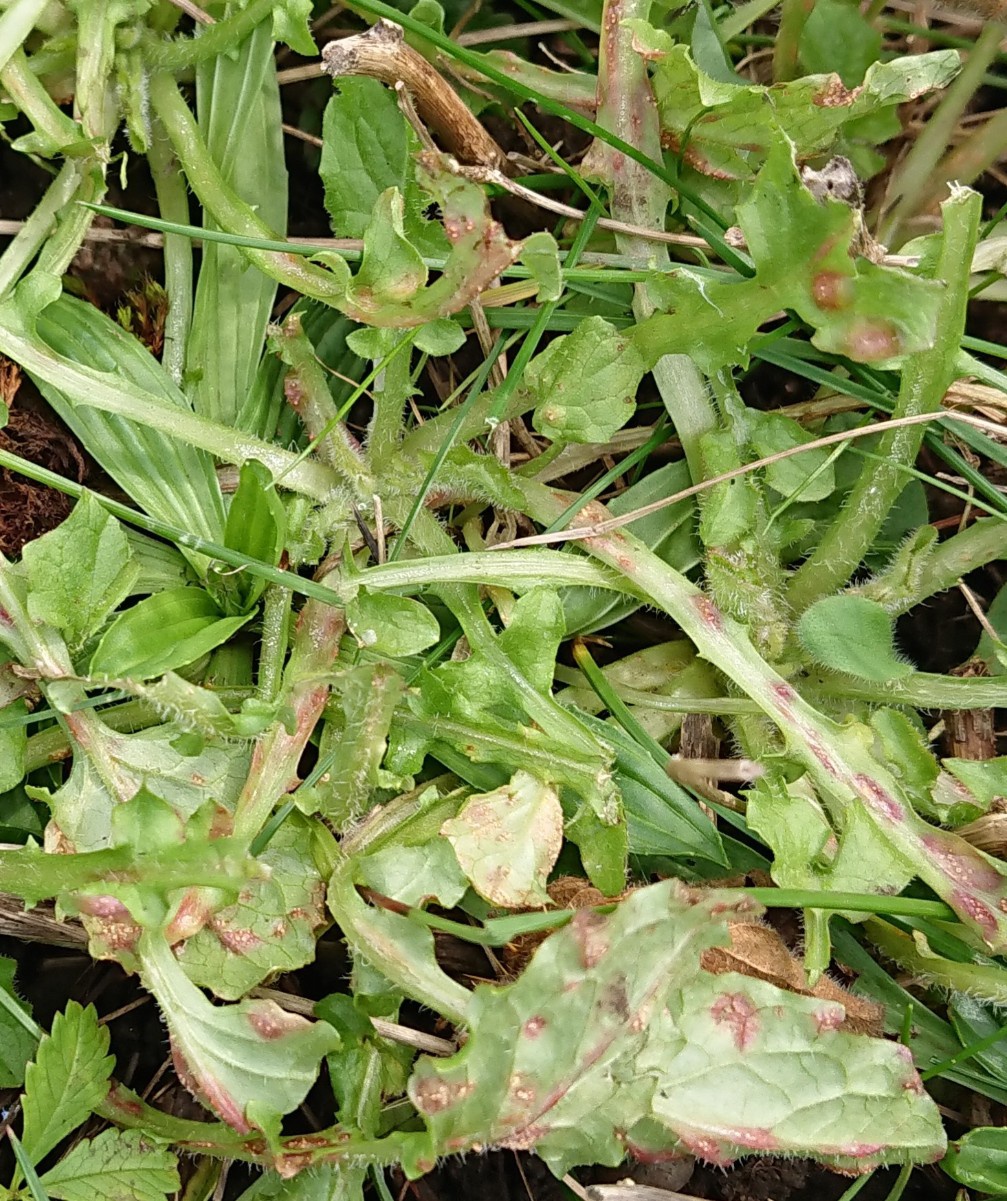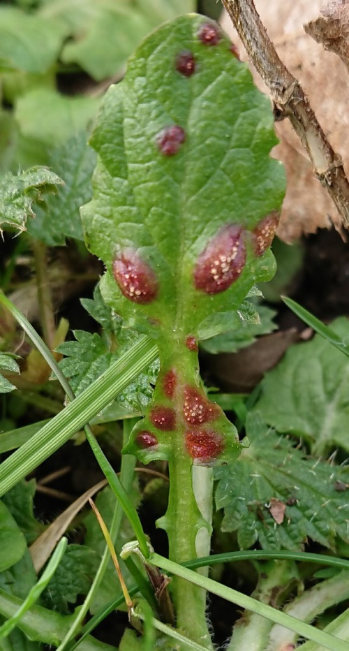 Puccinia lapsanae affects Nipplewort (Lapsana communis), causing galls in the aecial stage, often seen on the rosette-leaves early in spring. Leaf blades, veins and petioles have conspicuous reddish bulges with pale yellow aecia, on both sides of the leaf. Small chestnut-coloured uredinia and dark brown telia are present later, but are not gall causing.