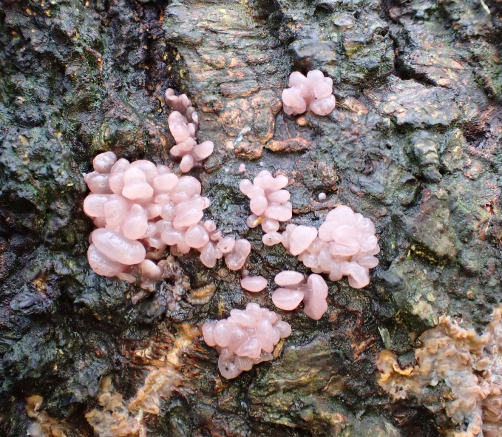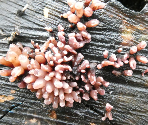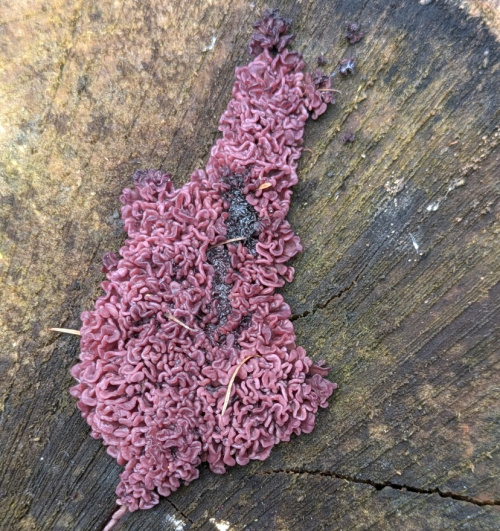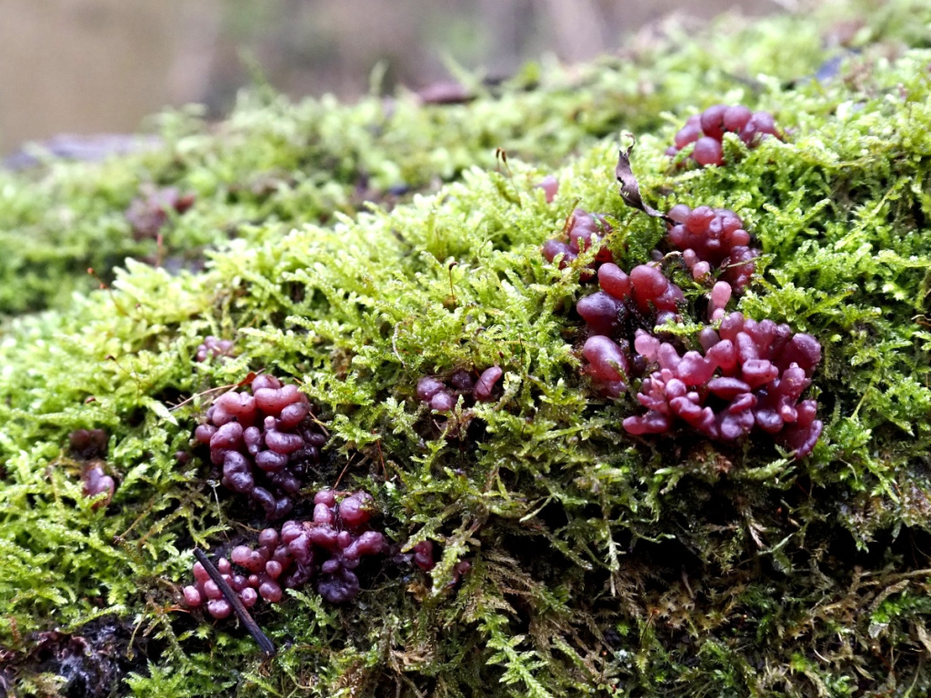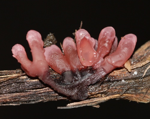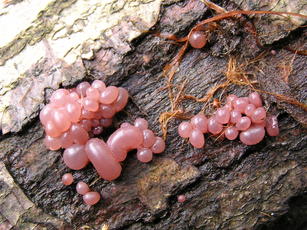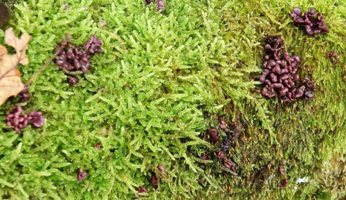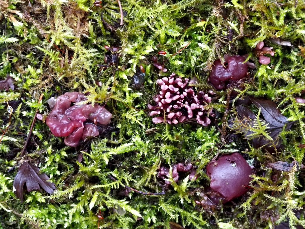 This species occurs in 2 forms. The asexual form (anamorph) looks like clusters of small pale to dark purple or wine-red clubs or fingers, which produce conidia. The texture is firm and gelatinous, and en masse they can appear brain-like. In its sexual form (teleomorph), it produces larger gelatinous discs or cups up to 1.5cm, which are smooth on the inner, fertile side and slightly downy outside; it may have a short or vague stem. This form produces the ascospores. The two forms often appear together.