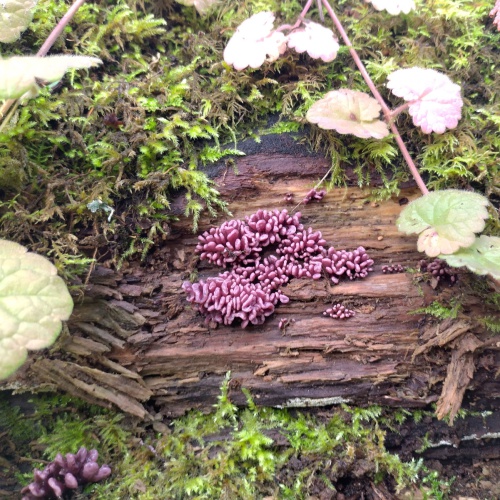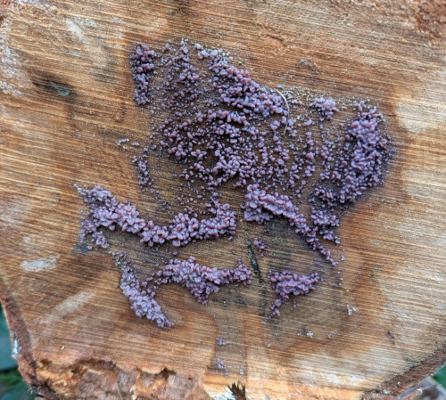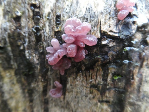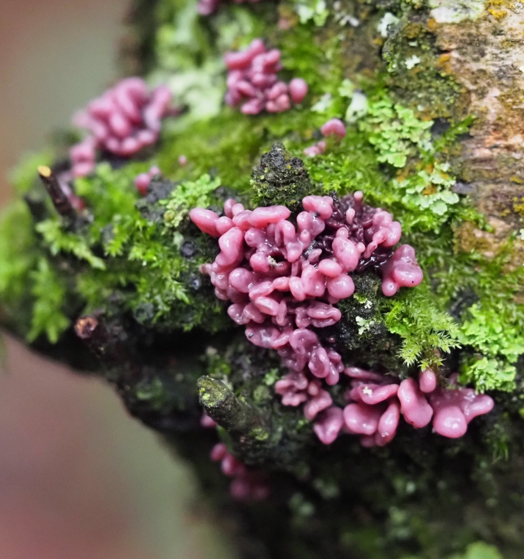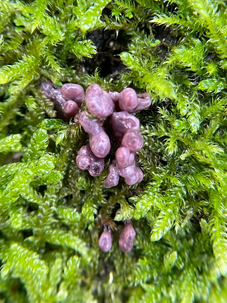 This species occurs in 2 forms. The asexual form (anamorph) looks like clusters of small pale to dark purple or wine-red clubs or fingers, which produce conidia. The texture is firm and gelatinous, and en masse they can appear brain-like. In its sexual form (teleomorph), it produces larger gelatinous discs or cups up to 1.5cm, which are smooth on the inner, fertile side and slightly downy outside; it may have a short or vague stem. This form produces the ascospores. The two forms often appear together.