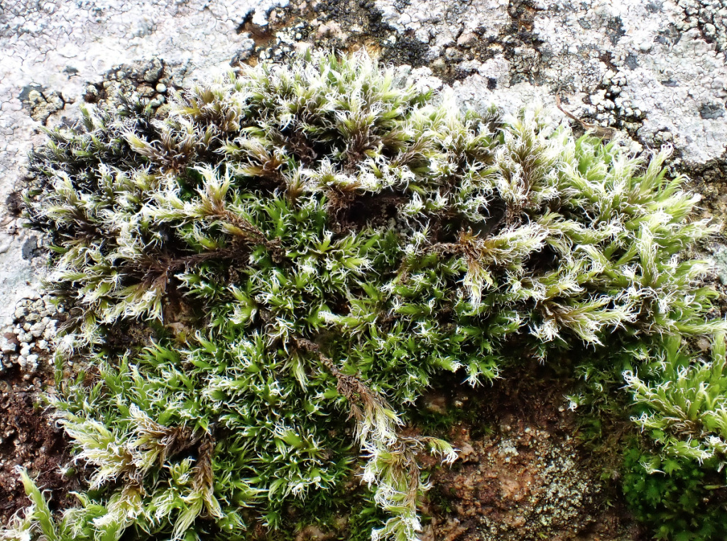 This large and distinctive moss is an upland specialist and only found in the Charnwood area in Leicestershire. It is grey-green and with a prominent hair point at the end of each leaf - giving it the 'woolly' appearance. Leaves are up to 6mm and typically curve in one direction. The hair point is toothed.