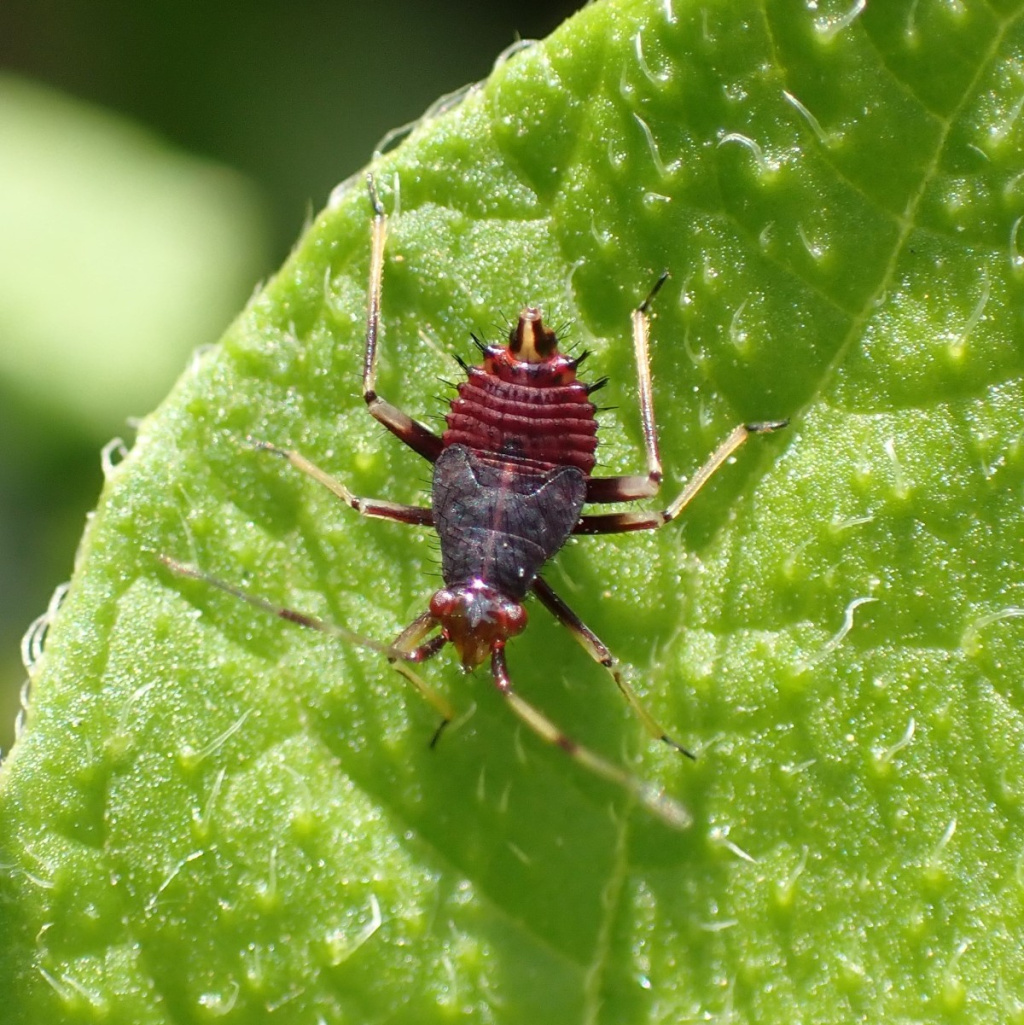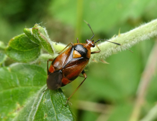 Length 6-8 mm. The ground colour (including the scutellum) ranges from red-orange to almost fully black, although the cuneus is always red to some extent. The forewings are very shiny. The tibiae are unbanded and the 1st antennal segment and at least the base of the 2nd are black.