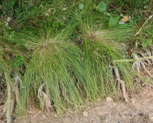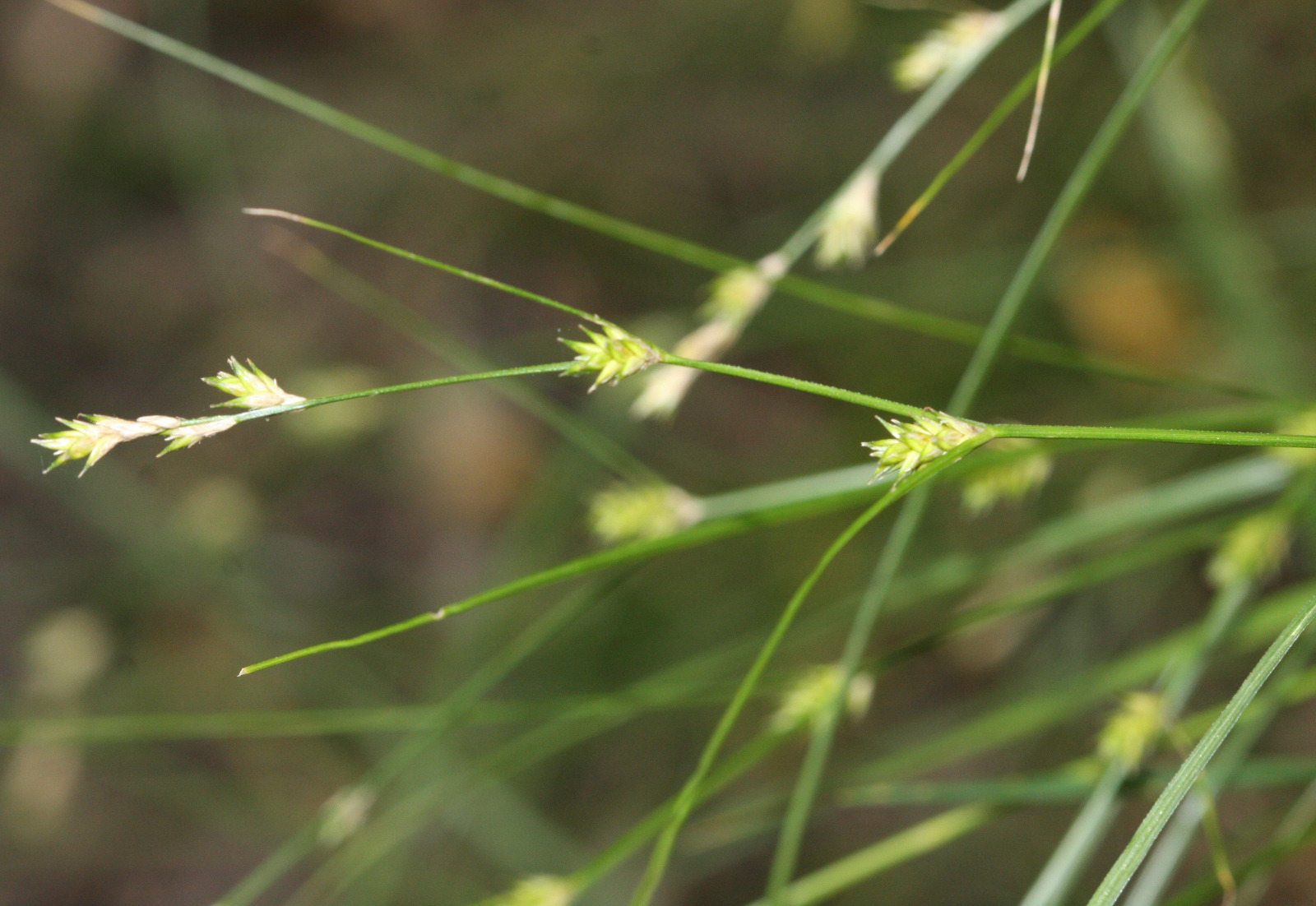 Tufted plant with short rhizomes, forming small tussocks with bright green leaves up to 30 cm tall. Inflorescence is very long (up to 1/3rd of stem length). With stalkless green spikelets well spaced out, the lower ones with very long, leaf like bracts.