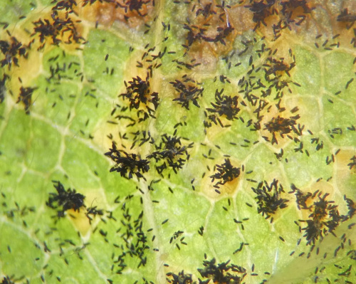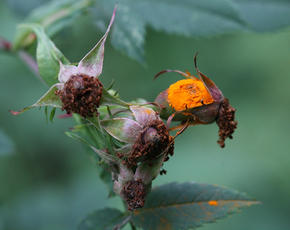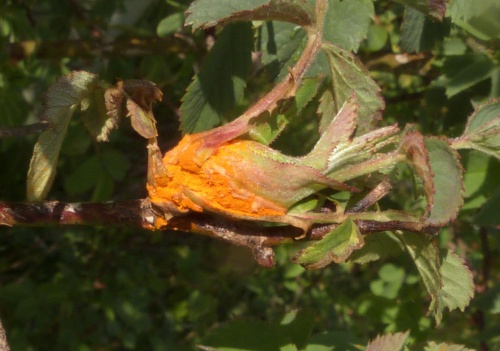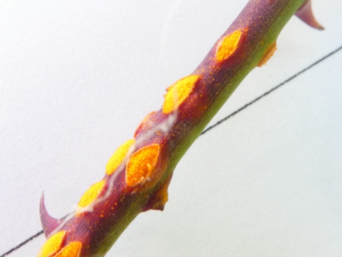 Rose Rust (Phragmidium mucronatum) is a gall-causing rust that affects some wild Rosa species, including Dog-rose and Field-rose. There is no host-plant alternation. In spring bright orange aecia appear on the leafstalks, branches, leaf underside and any remaining hips. During summer yellow-orange uredinia then develop on the undersides of leaves, becoming interspersed with black telia in late summer/early autumn. It usually overwinters in the form of teliospores associated with fallen leaves.