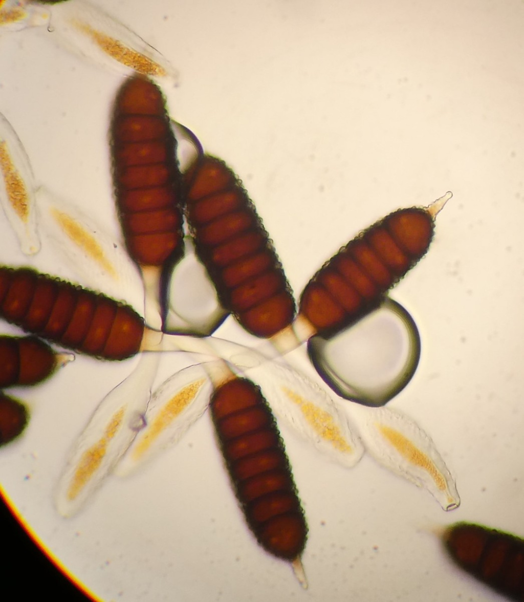 The aeciospores and urediniospores have a small pore, and the teliospores have 6-8 cells and an apiculus.