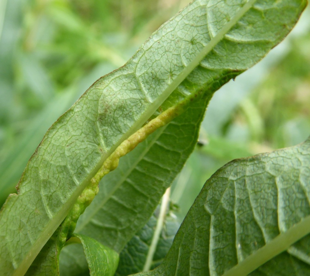 The larva of the gall midge Dasineura kiefferiana causes galls to form on the leaves of Rosebay Willowherb. The leaf margins roll inward or fold downward, narrow, tight and thickened, often flattened; 7 to 10 mm long but may coalesce to form a longer roll.