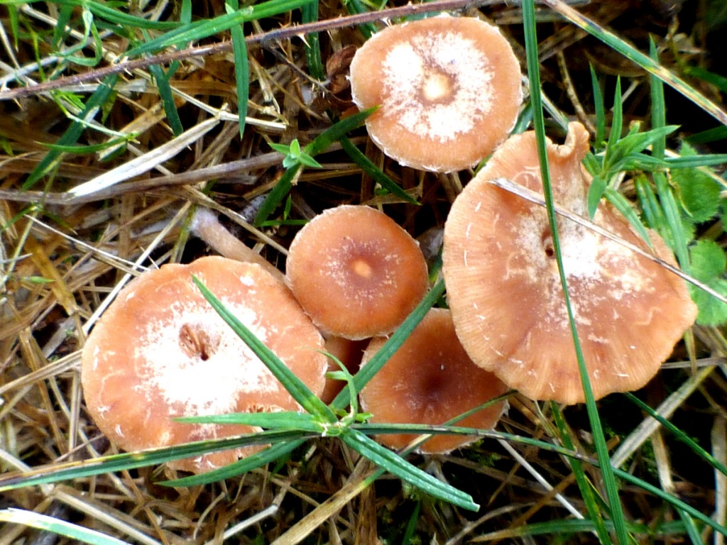 Cap smooth and orangey-brown, drying paler, wth a few white veil flecks at margins; pale brown gills; stipe same colour as cap, with faint ring zone and white felty base. Spores brown.