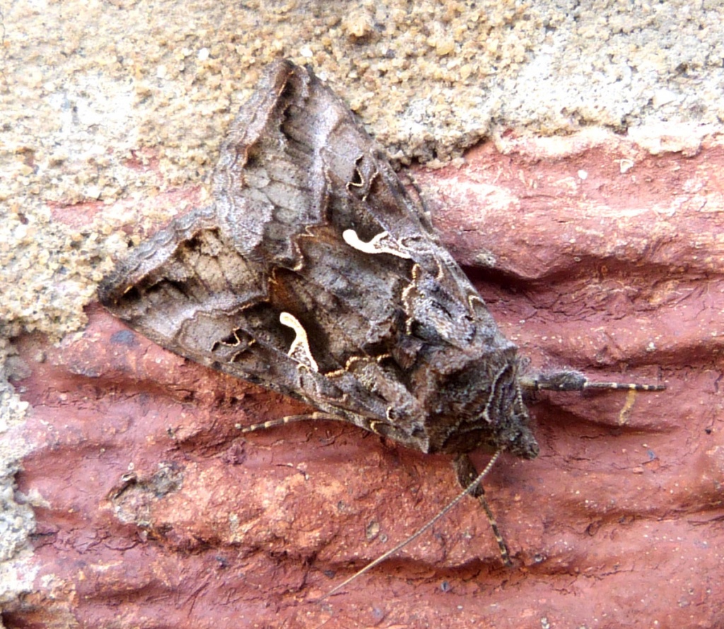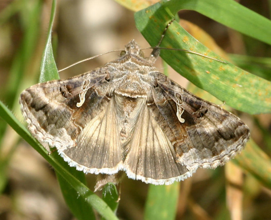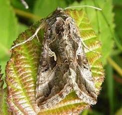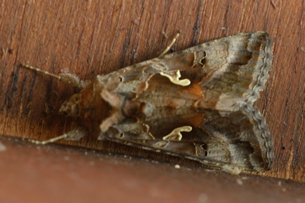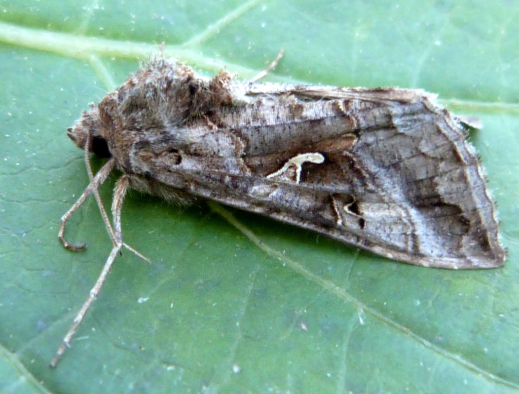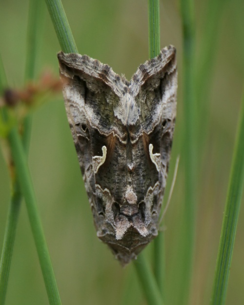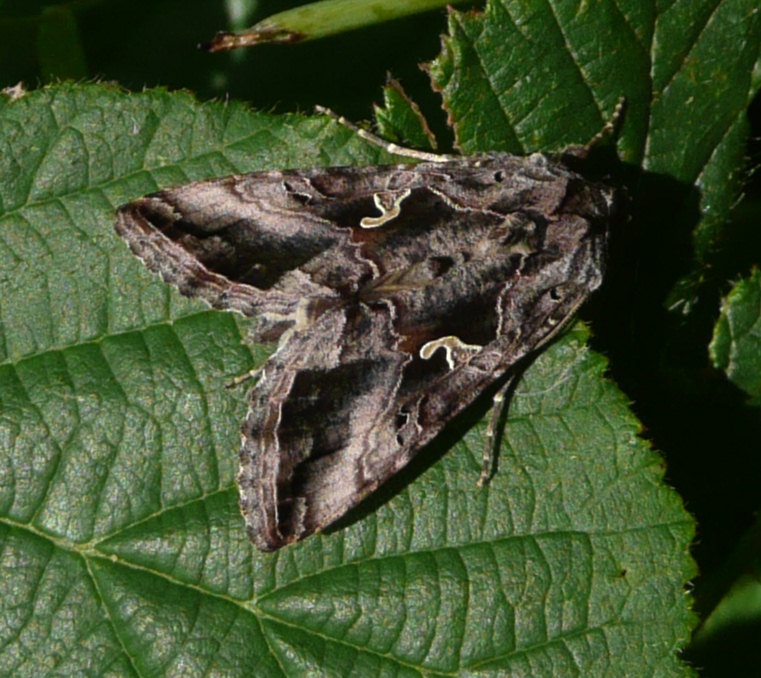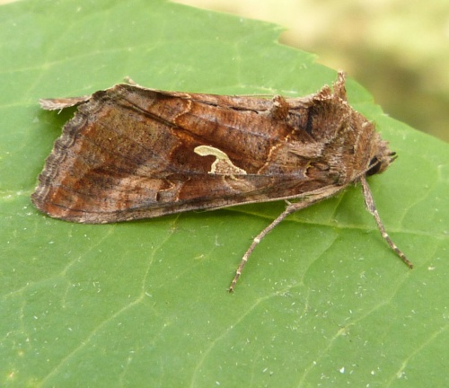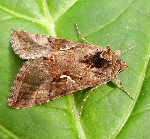 Wingspan 35-40 mm. It has a distinctive unbroken metallic silver 'Y' mark on the brown and grey marbled forewing, which sometimes has a purple tinge.