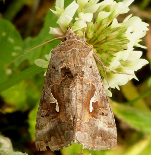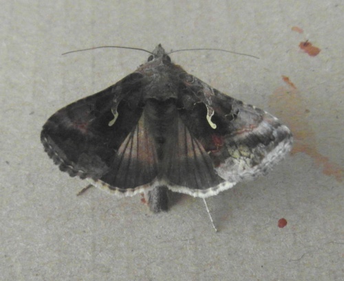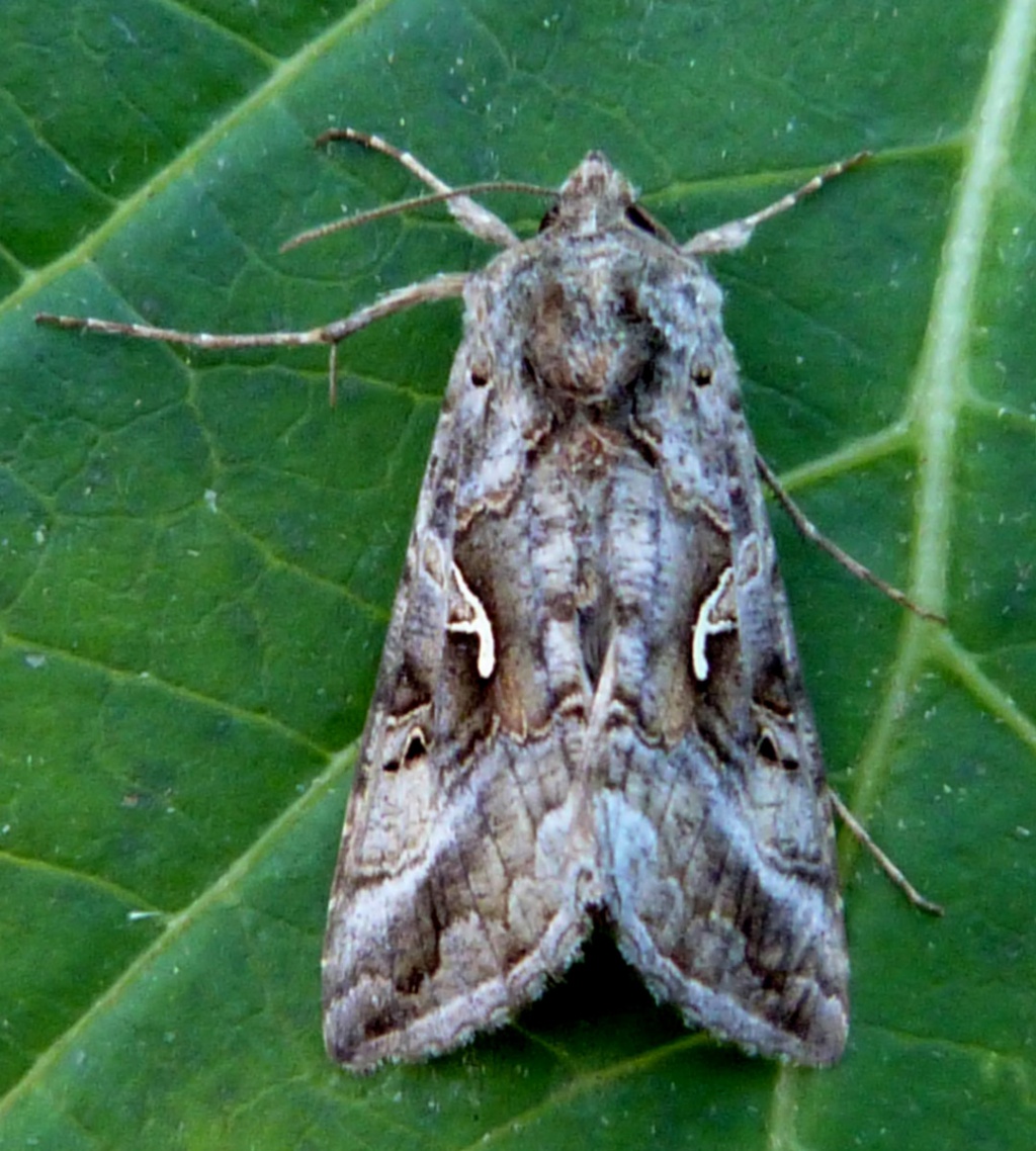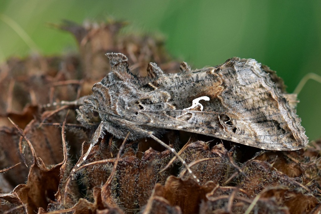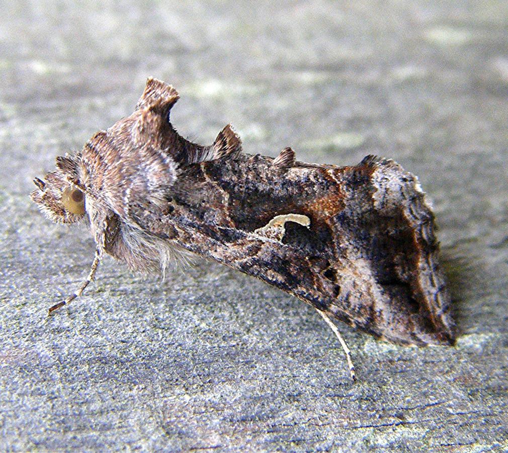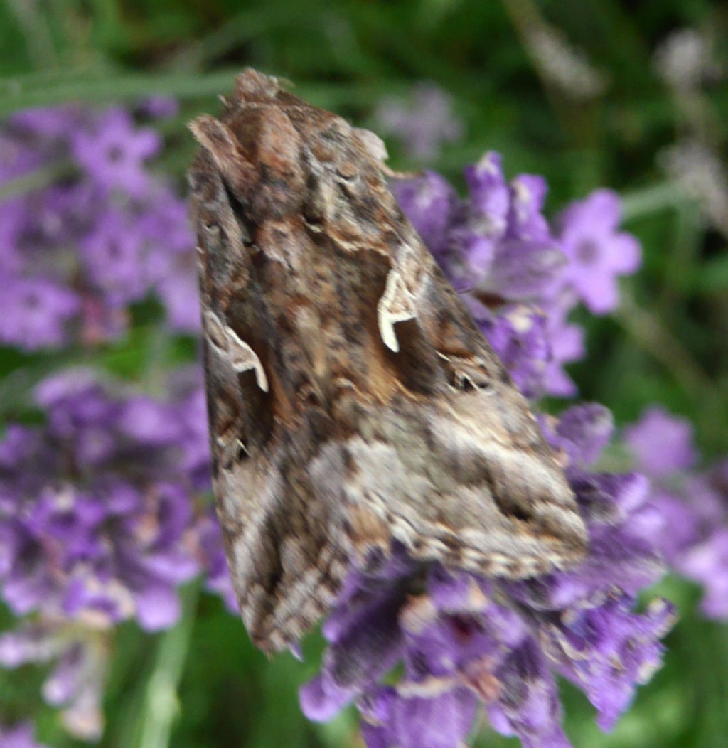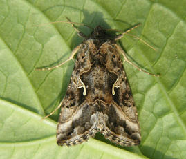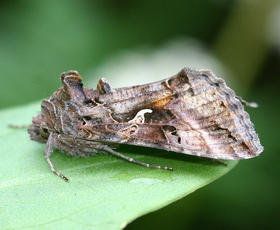 Wingspan 35-40 mm. It has a distinctive unbroken metallic silver 'Y' mark on the brown and grey marbled forewing, which sometimes has a purple tinge.