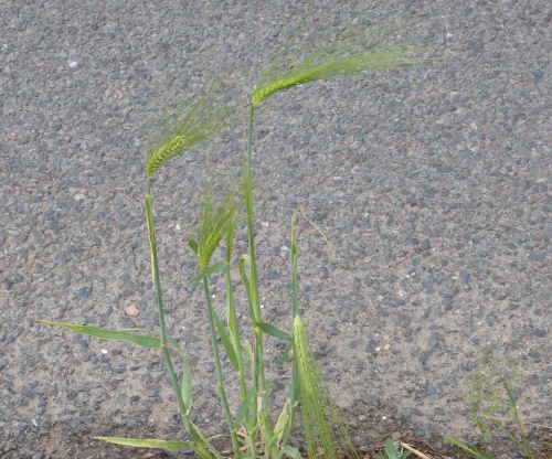 Hordeum vulgare has erect stems with few, alternate leaves its spike is notched on opposite sides, with three spikelets at each notch, each containing a small individual flower, or floret, that develops a kernel. All 3 spikelets in each row are fertile (H. distichon has only 1 fertile spikelet in each row).  Now rarely cultivated but persisting as occasional relic in waste places, etc.