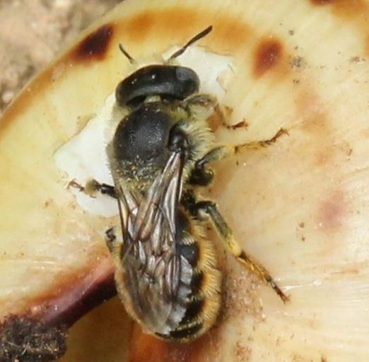 It is found in a range of open neutral or calcareous grassland habitats, provided that there are plenty of Asteraceae flowering and a degree of litter build-up around tussocks. This is where the snails, whose shells provide the nest site, live out their lives. Hay-cut and hard-grazed grasslands are not suitable for this bee.