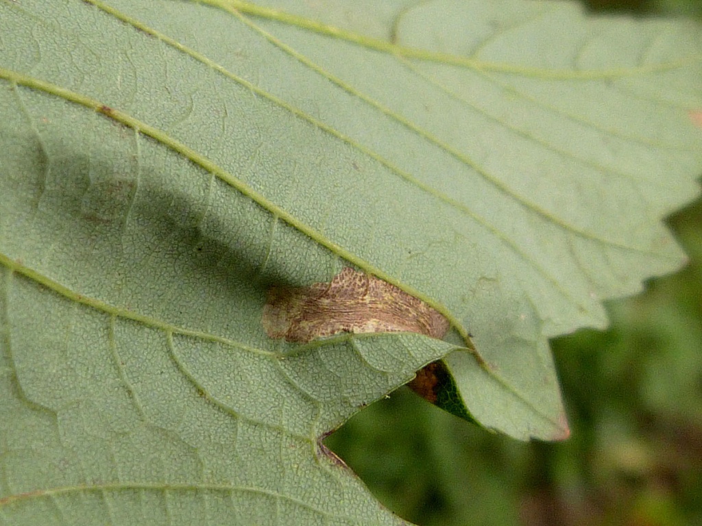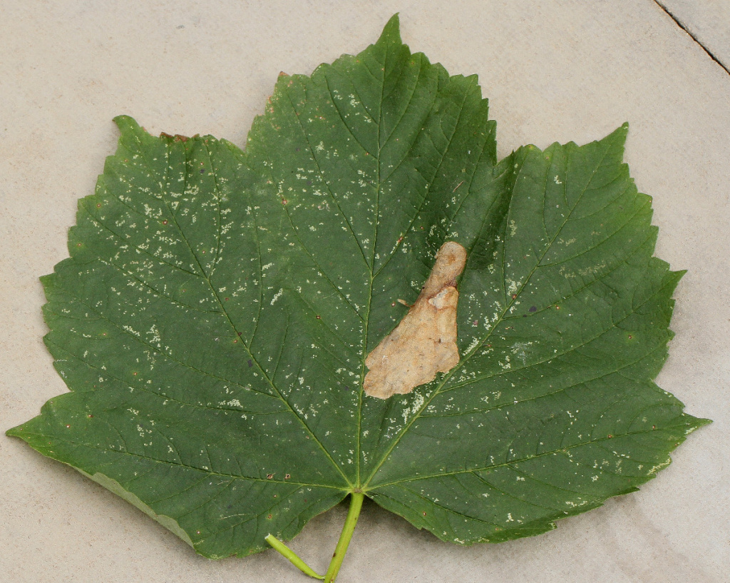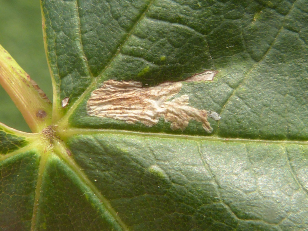 The larva of the Horse-chestnut Leaf-miner moth (Cameraria ohridella) mines the leaves of Horse-chestnut and occasionally Sycamore and other species. On its main host, Horse-chestnut, there can be many mines on a leaf and this moth can cause serious defoliation.