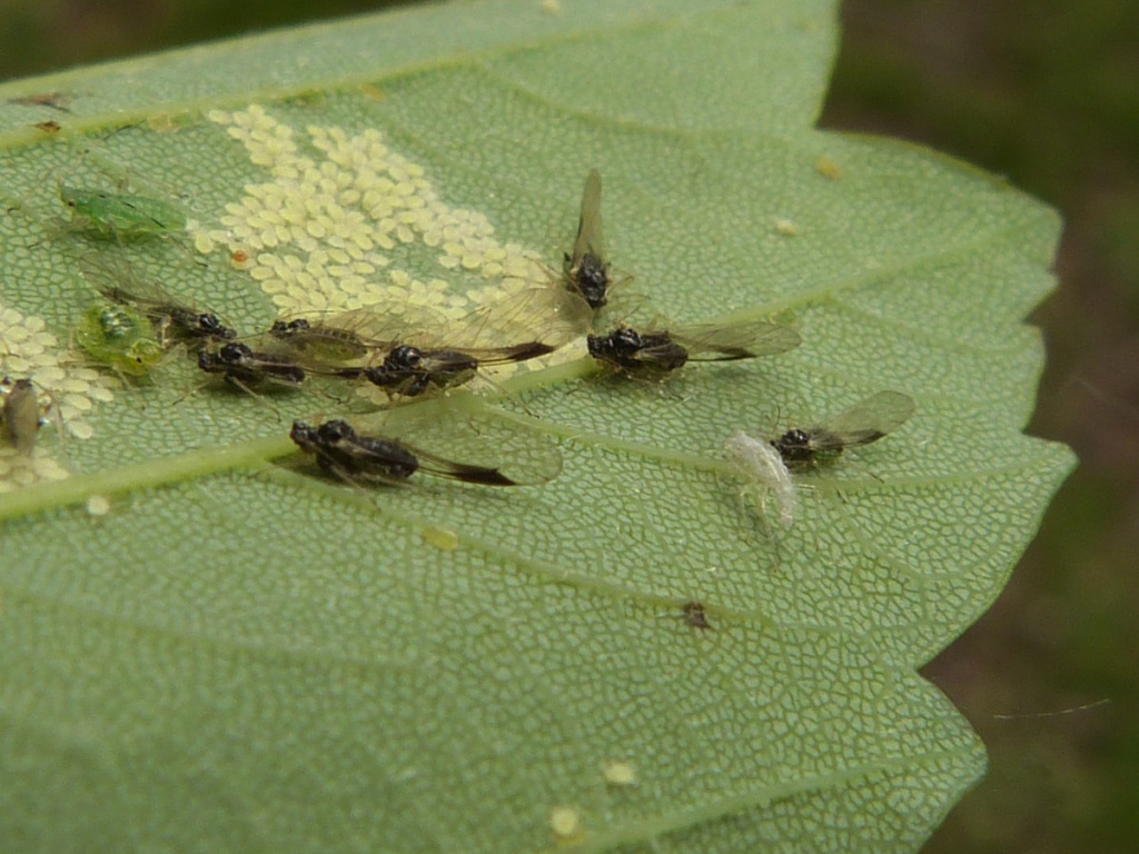 Periphyllus acericola colonies occur on the undersides of Sycamore leaves. Alates with closely spaced, black, abdominal cross-bars and black pterostigmata. White "dimorph" nymphs in dense groups.