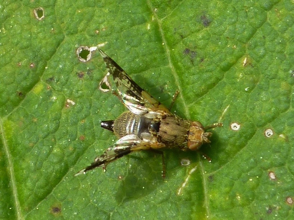 One of many similar fruit flies with heavily patterned wings. It is sometimes possible to identify a species based on the wing patterning but some variation does occur, even within members of the same species.
