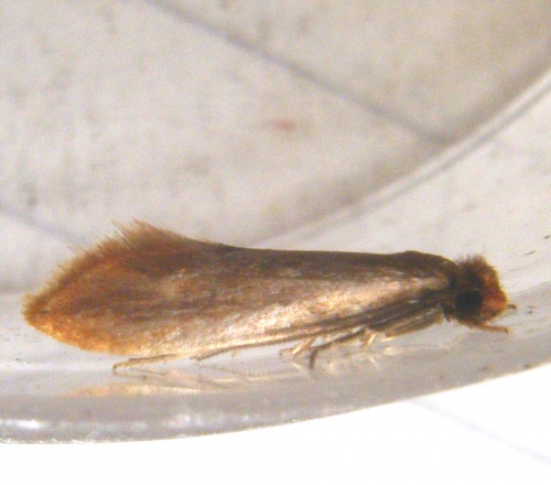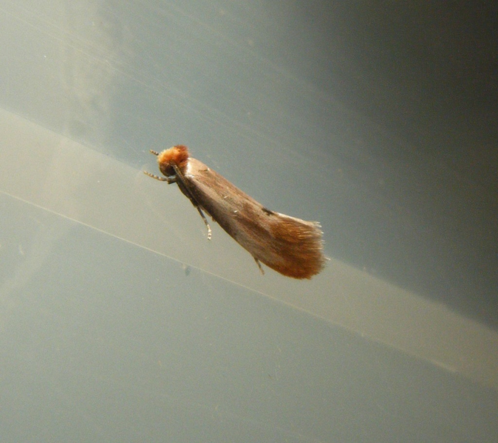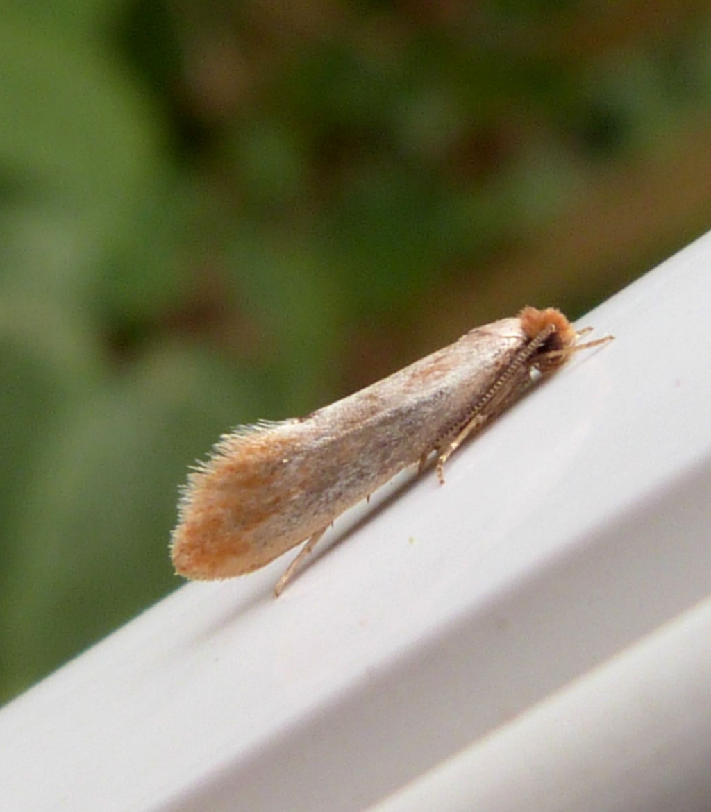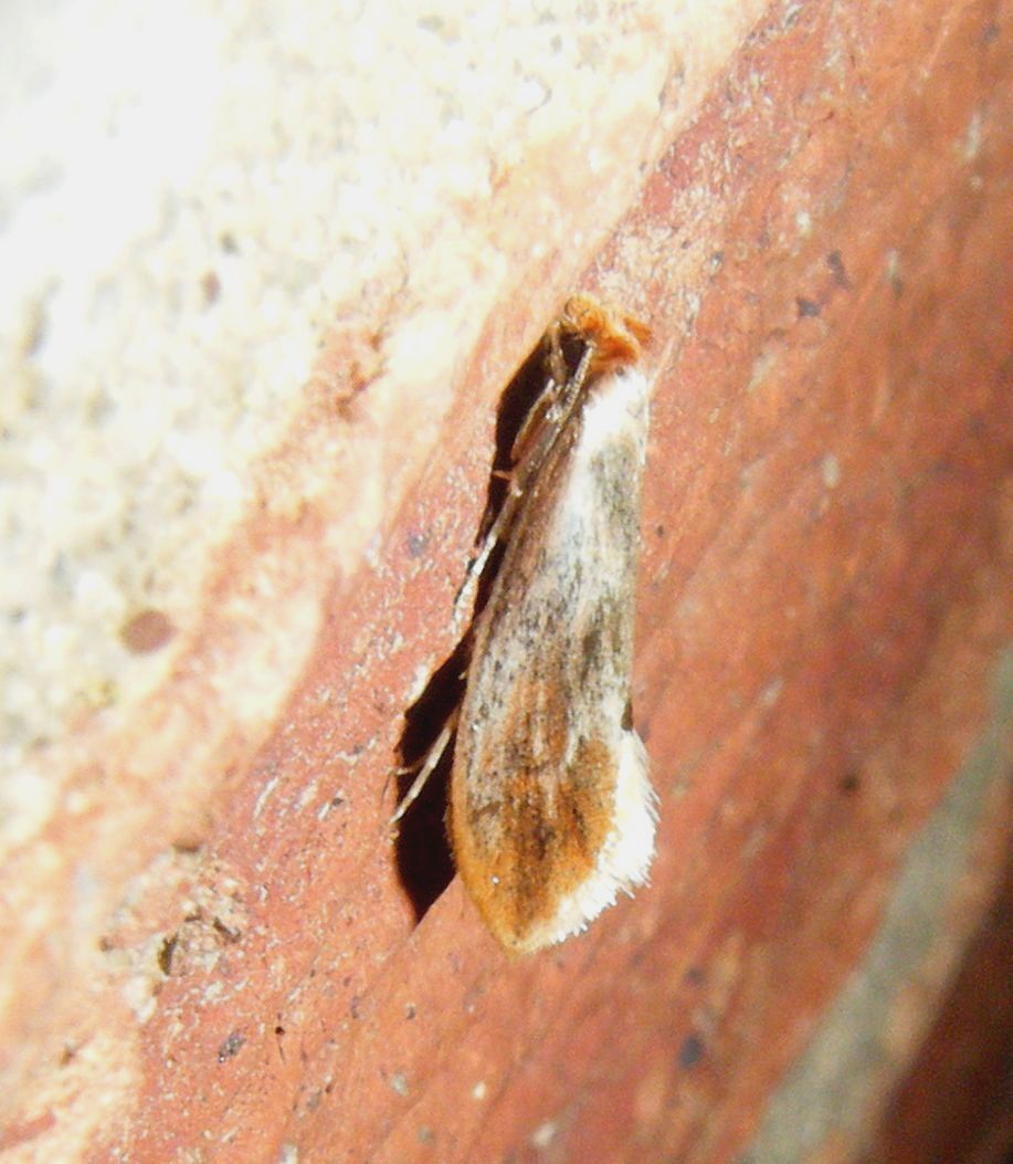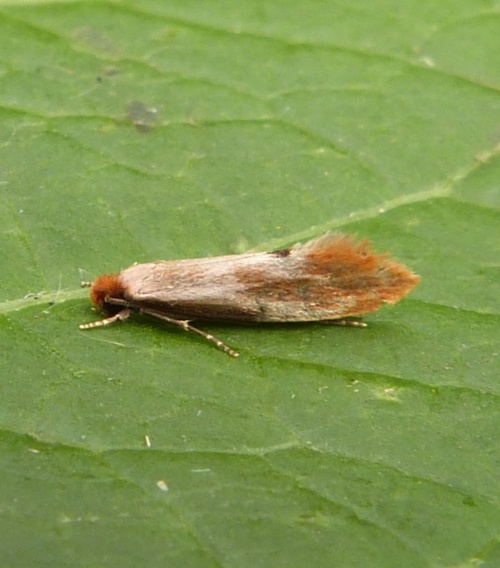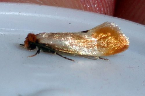 Wingspan 14 to 22 mm. Perhaps the most colourful of the British Tineidae, and one of the largest. With a striking orange head and a large orangey area on the wings, which are otherwise greyish white with a slight sheen.