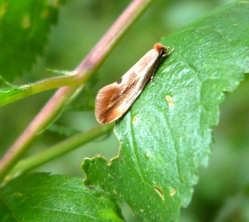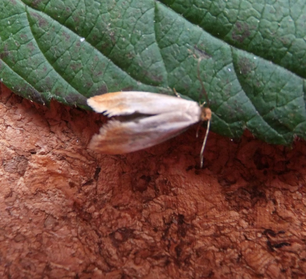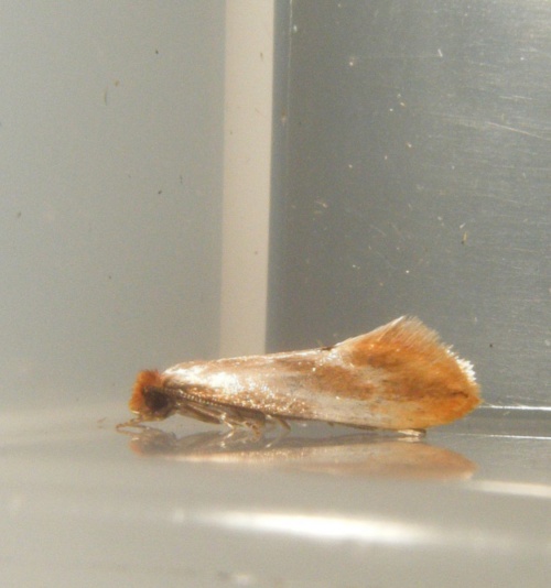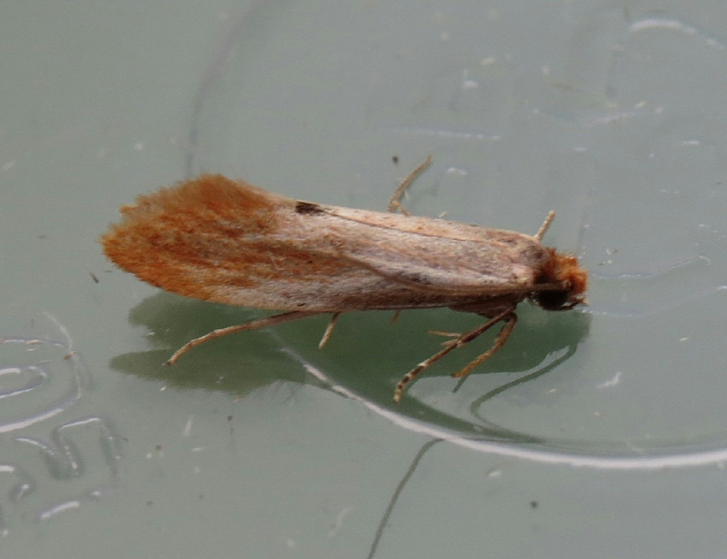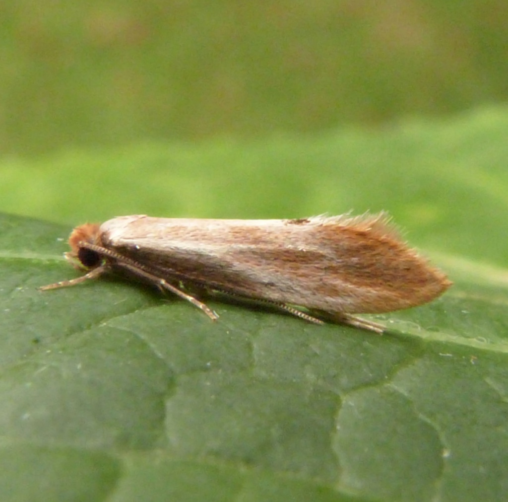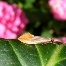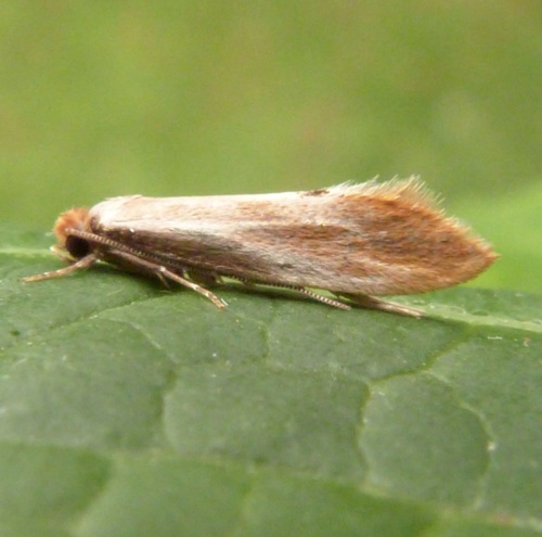 Wingspan 14 to 22 mm. Perhaps the most colourful of the British Tineidae, and one of the largest. With a striking orange head and a large orangey area on the wings, which are otherwise greyish white with a slight sheen.