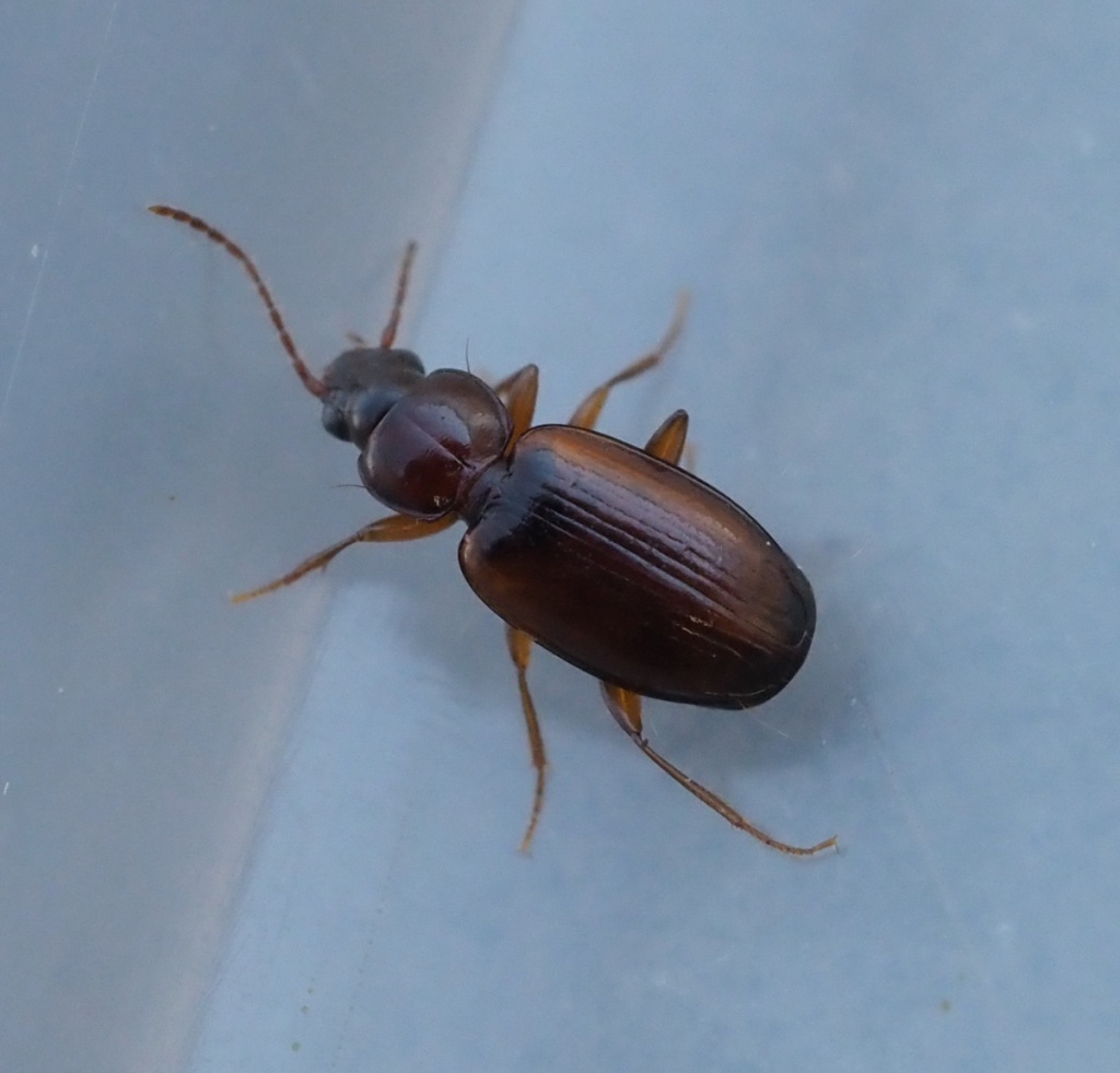 A small (about 4 mm) orange / brown ground beetle; the head and sometimes the pronotal disc being darker. It is a broad and flat species with weakly rounded and somewhat parallel elytra. The head is shiny black.