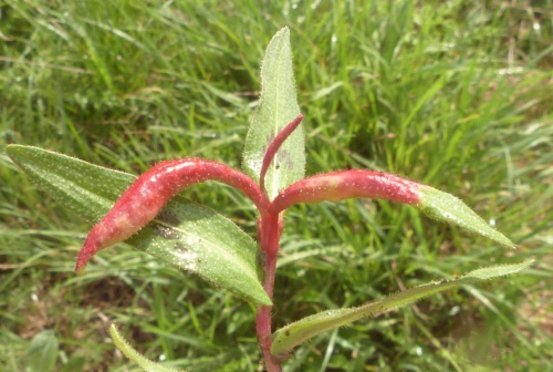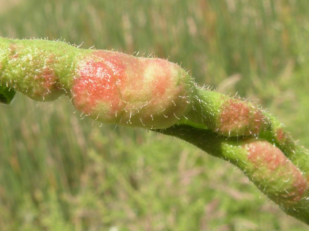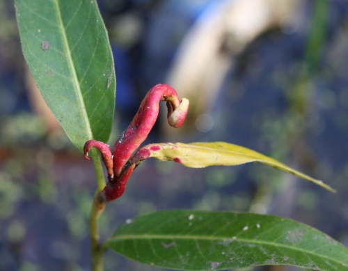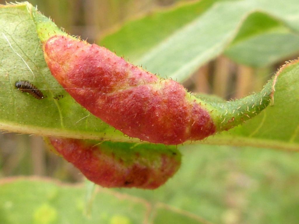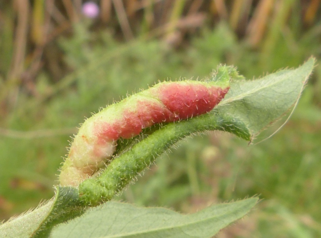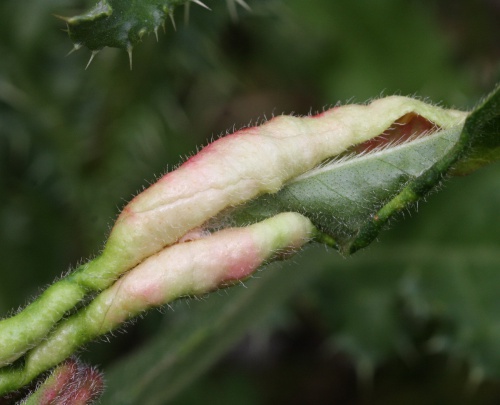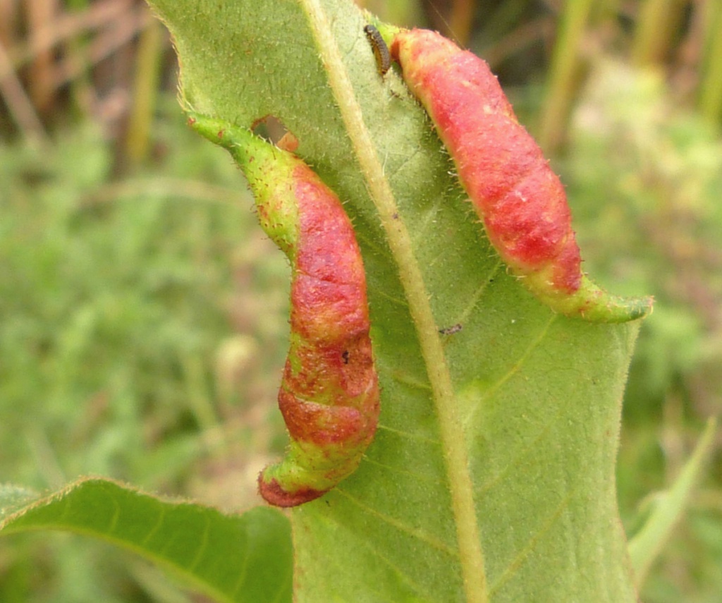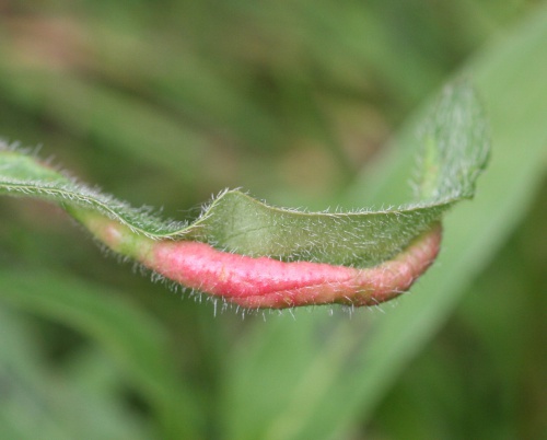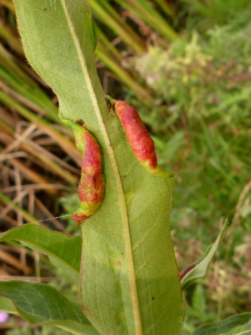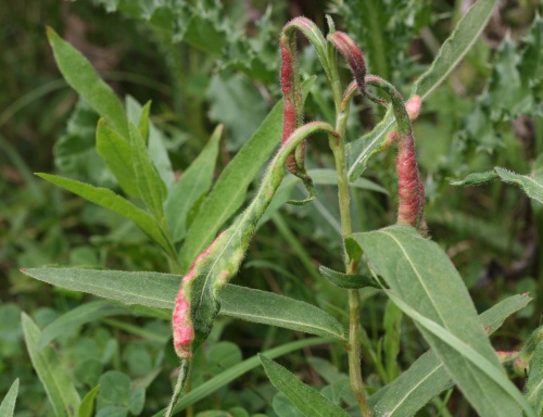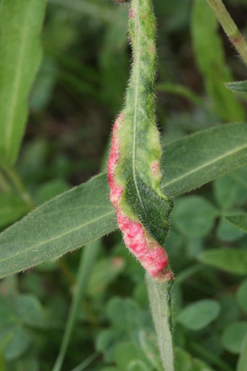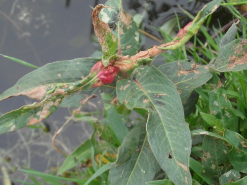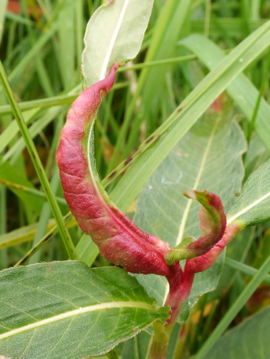 The larva of the gall midge Wachtliella persicariae causes galls to form on various plants of the Polygonaceae family including Amphibious Bistort and Redshank. The gall takes the form of marginal rolls, usually on both sides of the leaf which become markedly thickened and often spirally or otherwise contorted. Often several leaves at the shoot tip are affected.