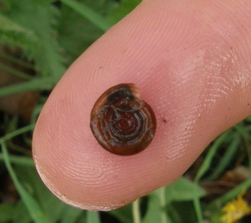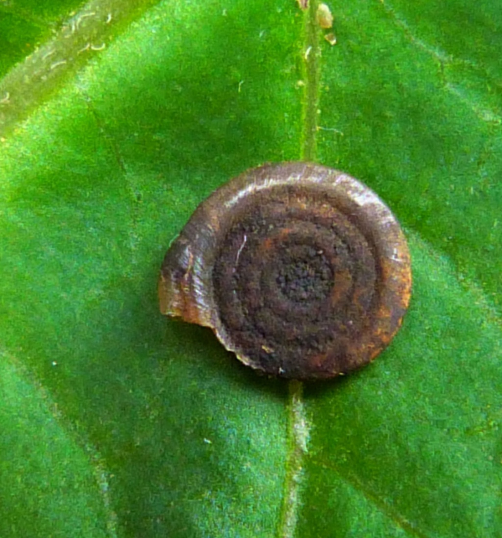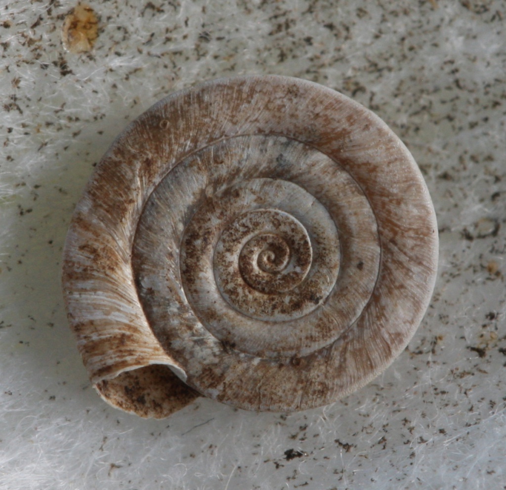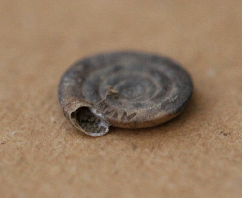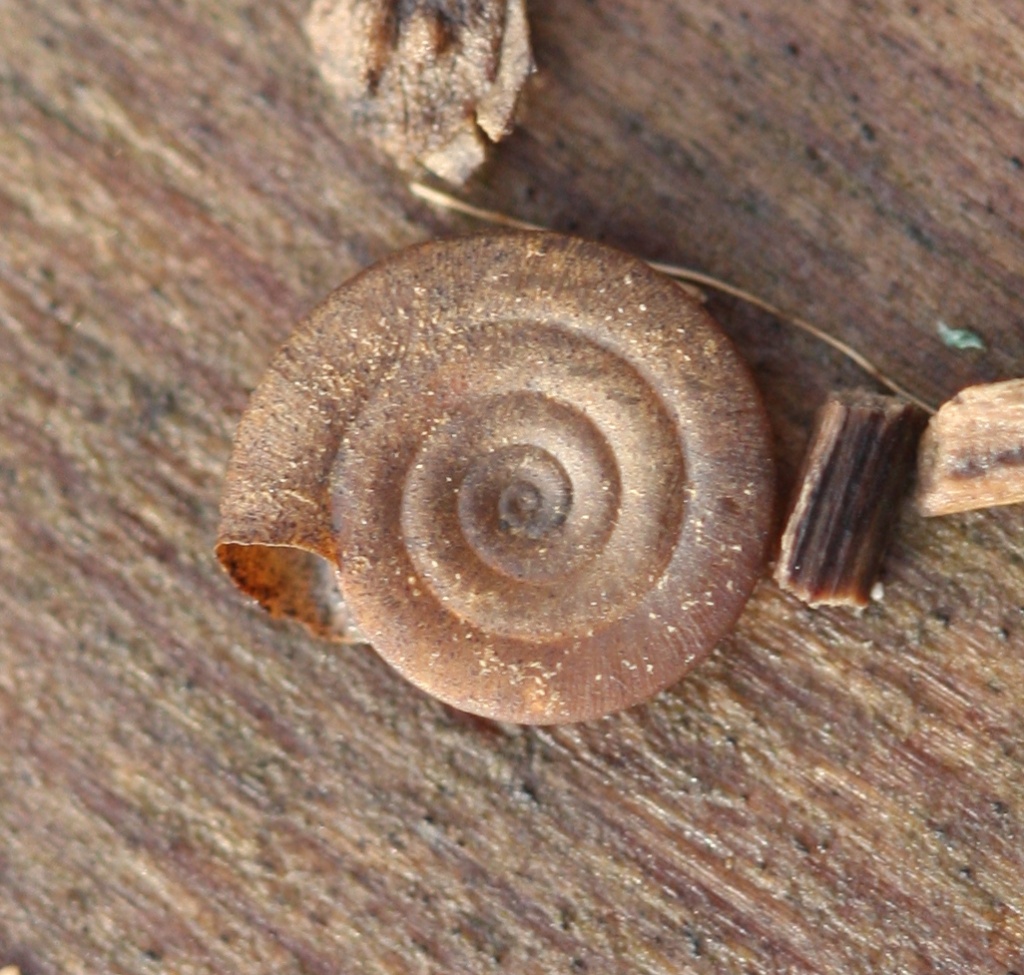 Shell size: 7-10mm. This is a small snail is usually pale brown with 6 to 7 tightly coiled whorls. The shell is very thin and flat with a sharp keel at one edge and the outer shell wall noticeably angled away from this keel.