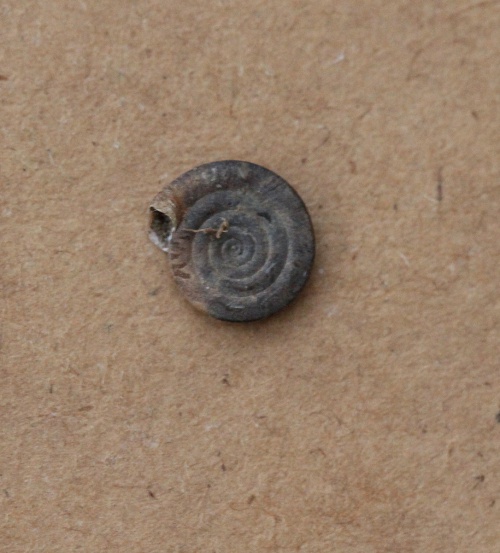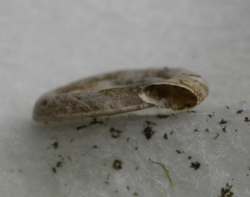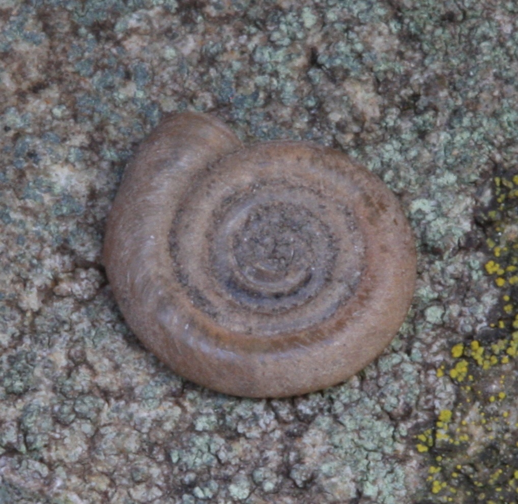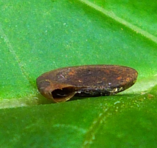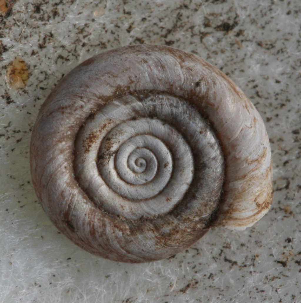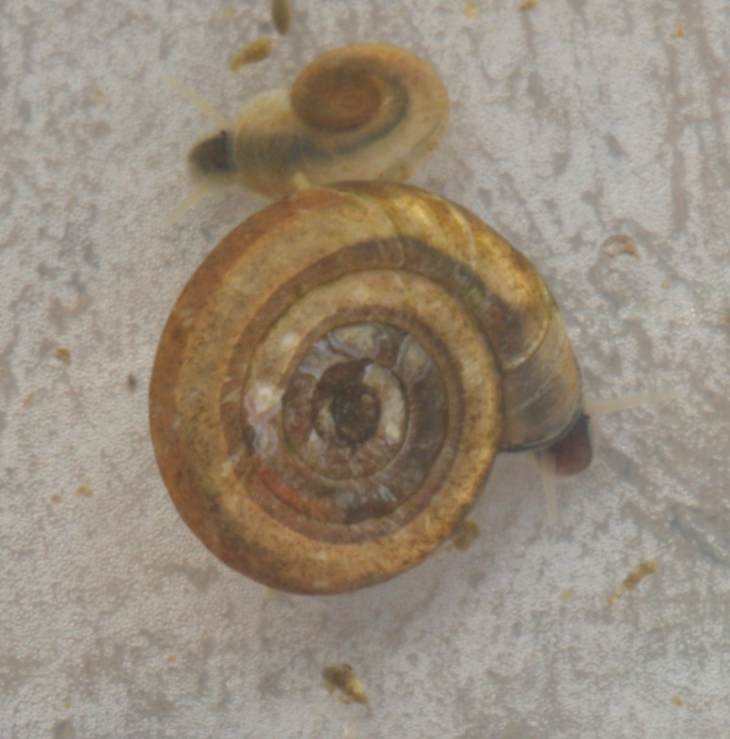 Shell size: 7-10mm. This is a small snail is usually pale brown with 6 to 7 tightly coiled whorls. The shell is very thin and flat with a sharp keel at one edge and the outer shell wall noticeably angled away from this keel.