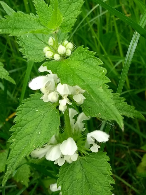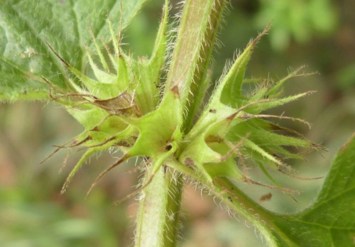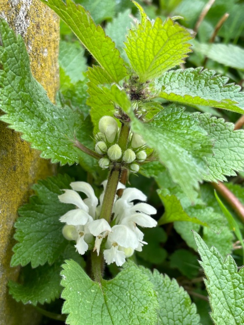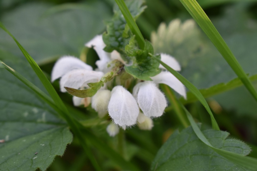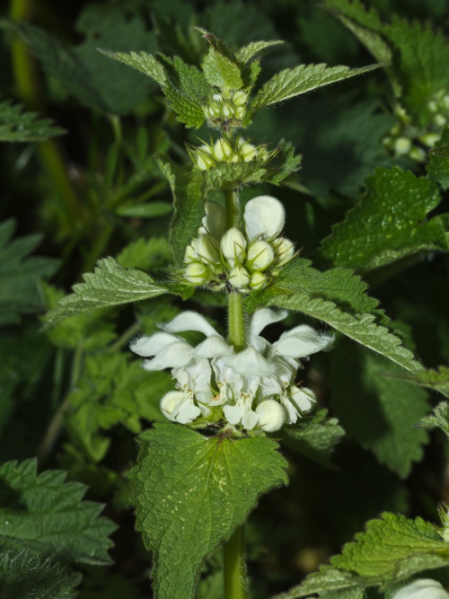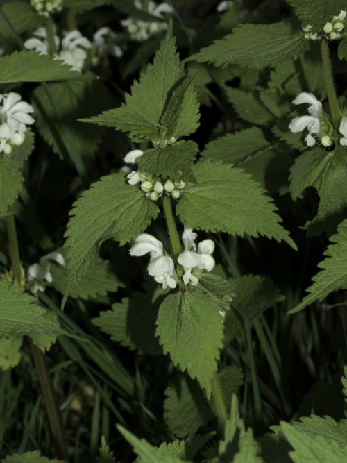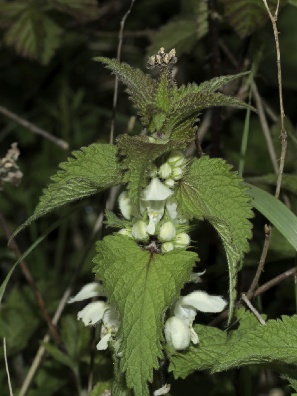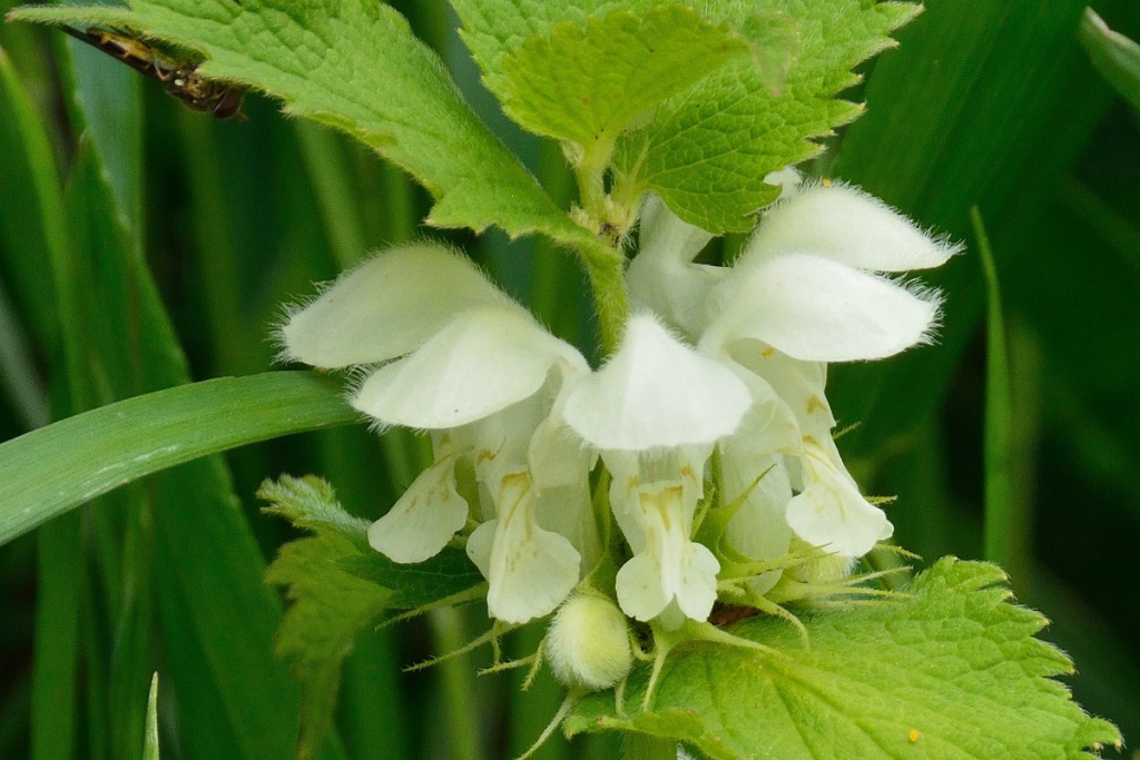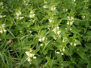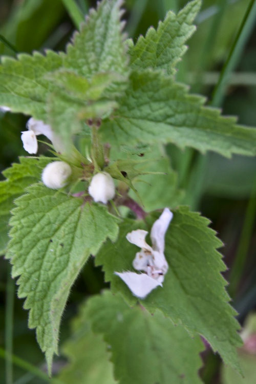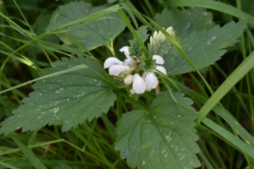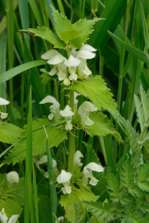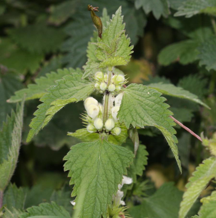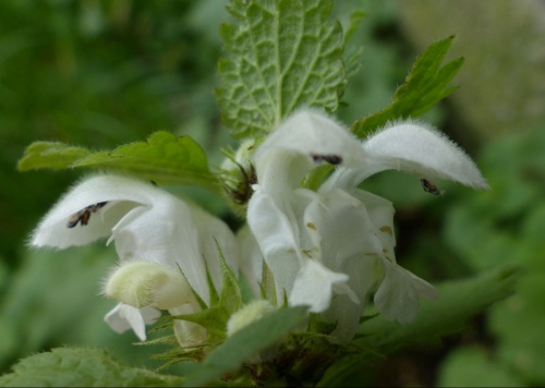 The larvae of the Agromyzid fly Agromyza flavipennis mine the leaves of Lamium species such as White Dead-nettle as well as Yellow Archangel and Ground-ivy, creating a large pale blotch at the edge of the leaf.