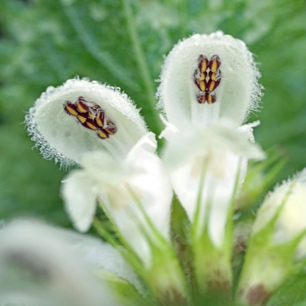 Short to medium, faintly aromatic and patch forming plant. Stoloniferous, stems spreading to erect. Leaves heart shaped to oval, toothed and stalked. Flowers white 20 to 25 mm long the corolla tube curved near the base. The upper lip is very hairy, the lower lip with 2-3 small teeth.