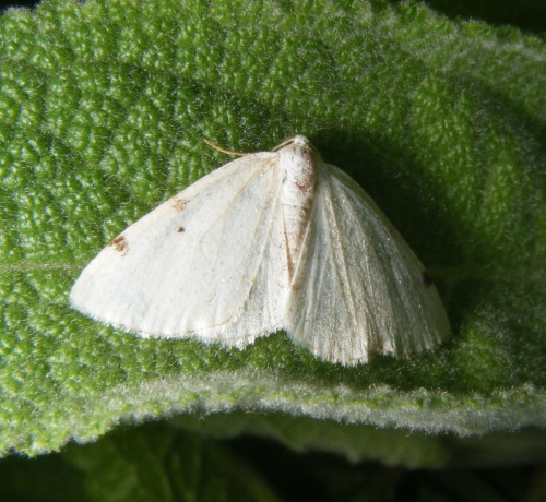 Wingspan 22 to 26 mm. Unmistakable white moth with two dark spots on the leading edge of each forewing.
