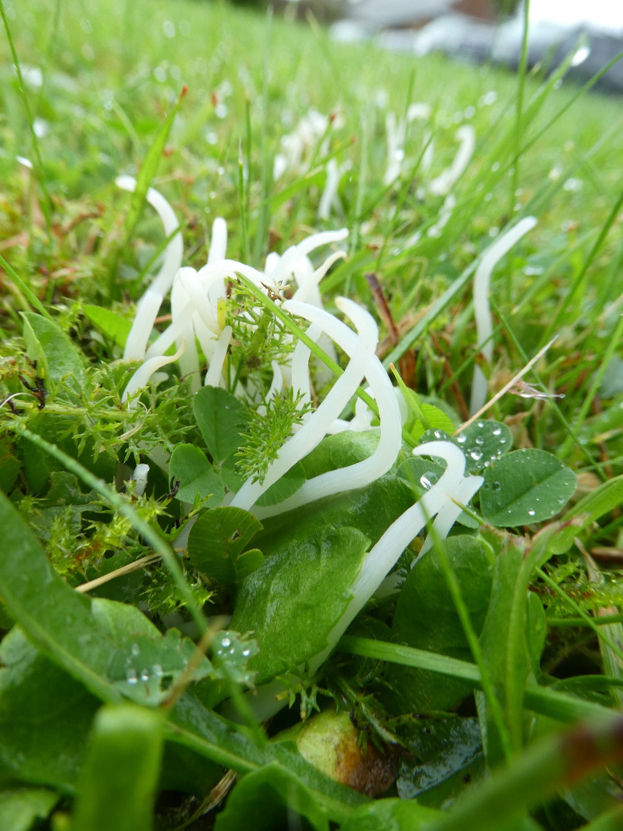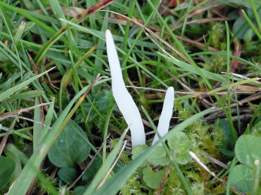 The fragile white unbranched clubs growing in grassland.may either be White Spindles (Clavaria fragilis) or Pointed Club (Clavaria acuta or Clavaria falcata sensu lato.) It is very hard to separate these, even with microscopic examination, and a number of other speces may be present in the C. falcata speces complex.