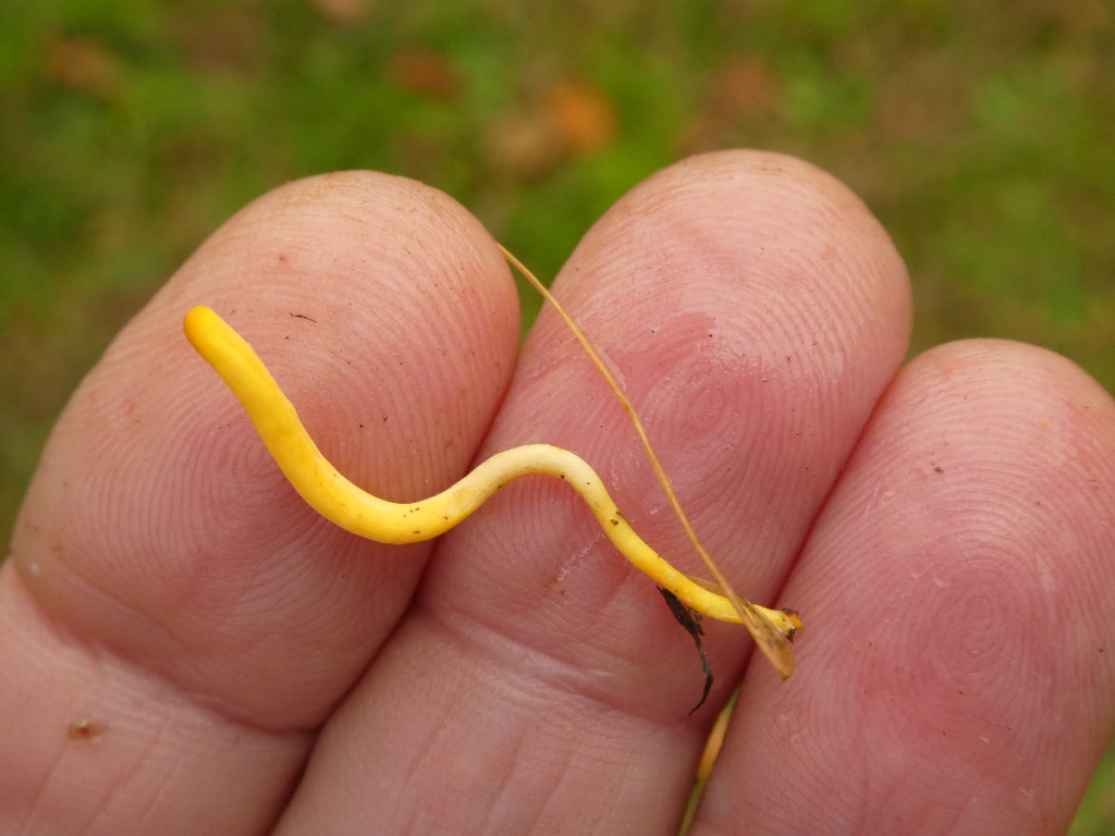 A small bright yellow club found in grasslands, usually solitary or in small groups. It is usually unbranched, and individual clubs are often twisted; tips are usually blunt. The spores are small, round, and covered in warts.