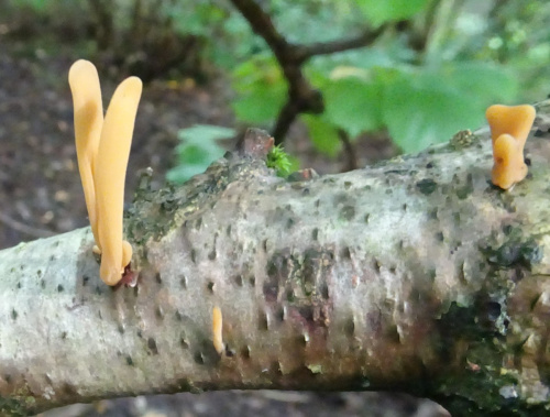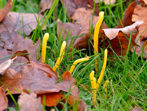 Note that the yellow Stagshorn fungi Calocera spp. found on rotting wood are in a different section (https://www.naturespot.org/family/dacrymycetaceae) and the club-shaped Earth-tongues and Caterpillar-clubs are ascomycetes, within a completely different branch of the fungal kingdom.