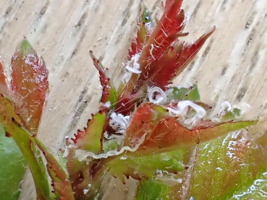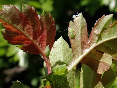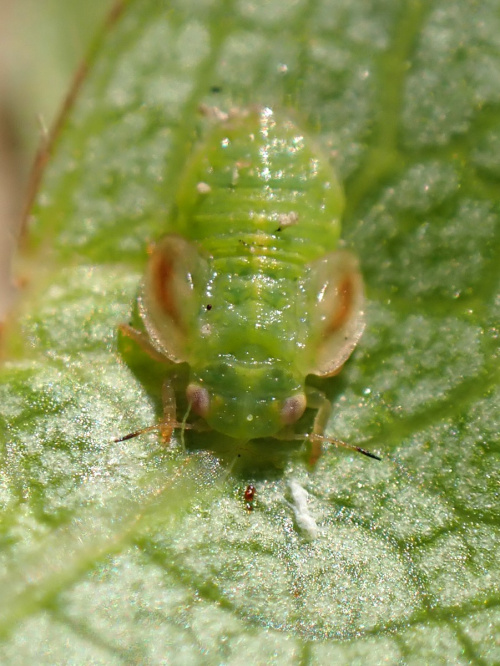 A very common psyllid found on hawthorn. Initially green in spring, it becomes orange, brown and black as the season changes to summer, Adults are hard to identify, but the nymphs have a brown streak on the wing-buds.