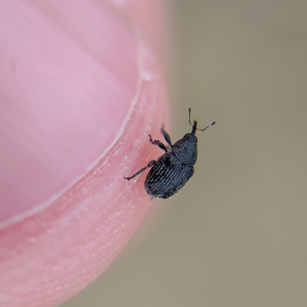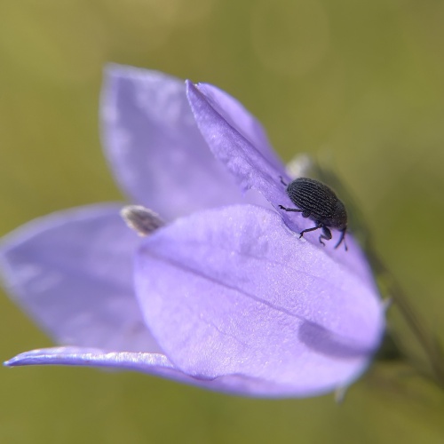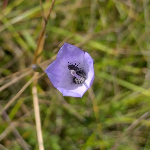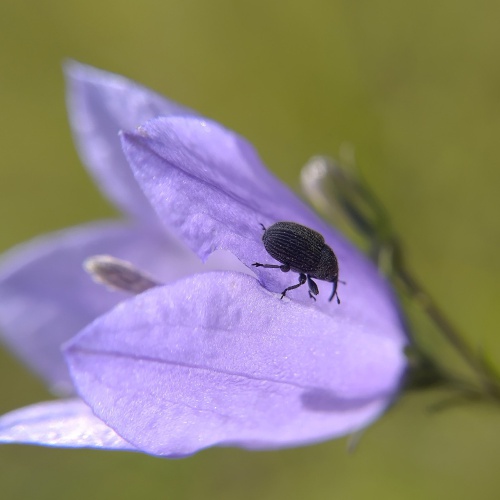A small grey-black weevil (around 3mm). The larvae cause galls in the flowers of Harebells and other Campanulaceae.