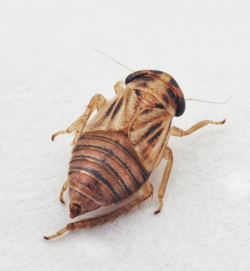 Length 2.5-3.5mm. The most distinctive species in this genus. Very short wings with dark streaks, abdomen with transverse bands.