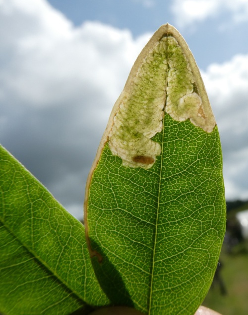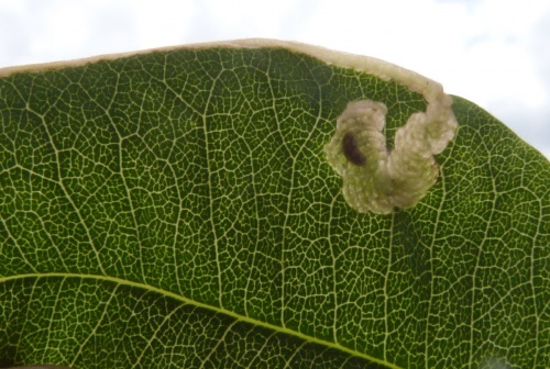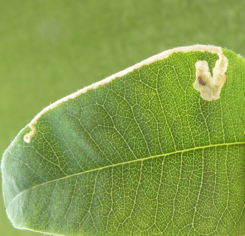 Provide backlit photographs of the whole leaf-mine in the leaf, and the larva, and note the host plant.