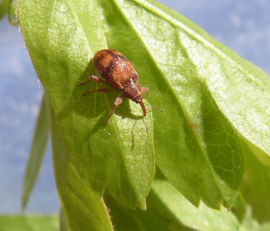 Measuring around 4 mm, this is a chestnut brown weevil with white markings on the elytra which may be quite faint.