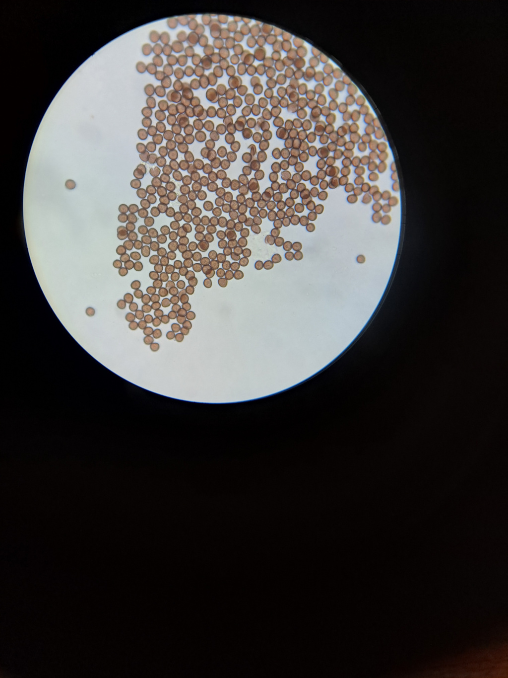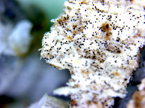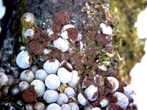 The slime mould starts off as a yellow slime, but the sporangia are grey and hang in clusters from yellowish brown stalks. The sporangia have an iridescence and white granules on the surface.