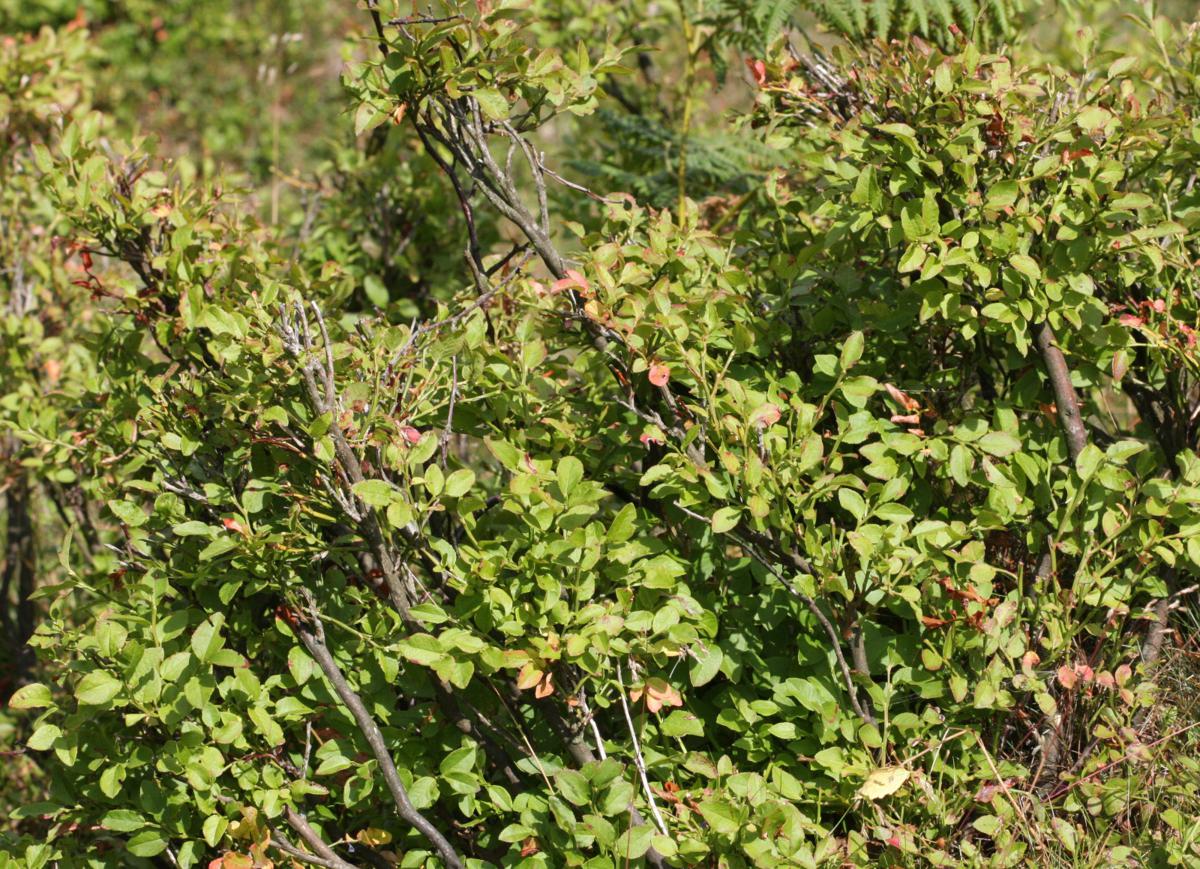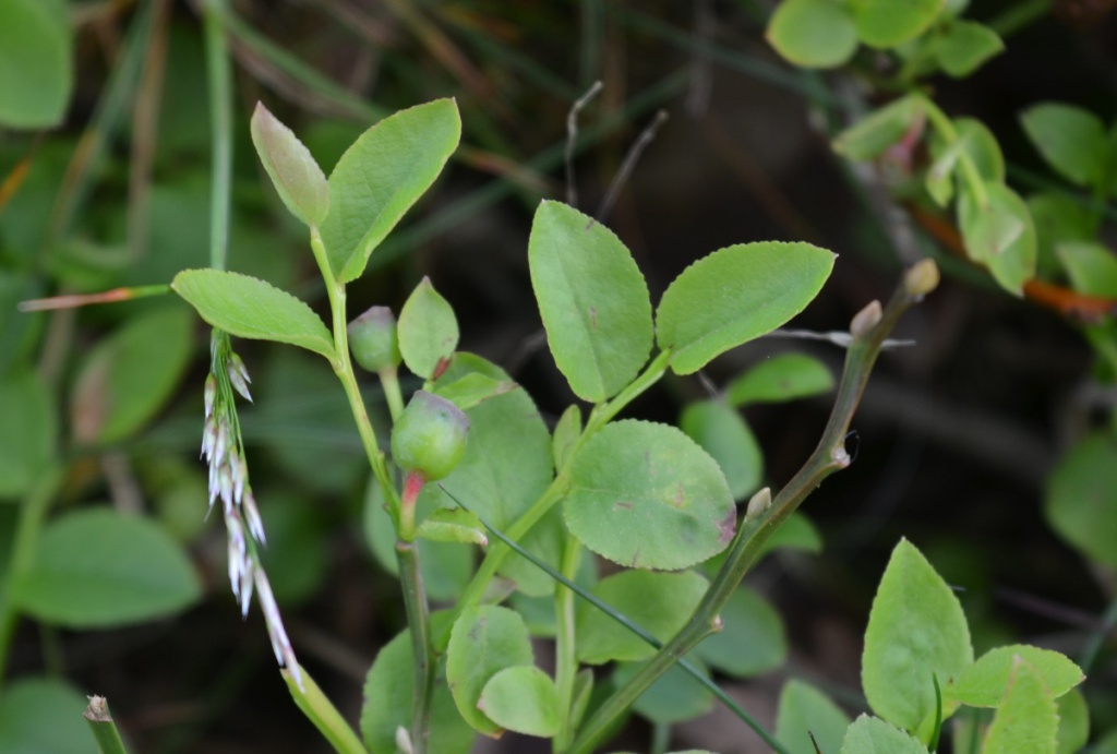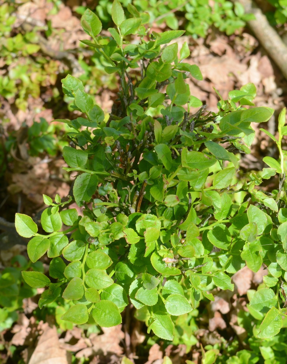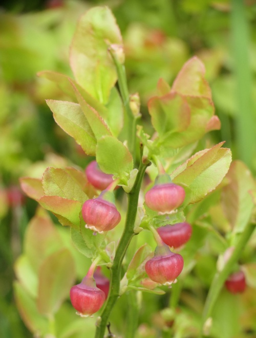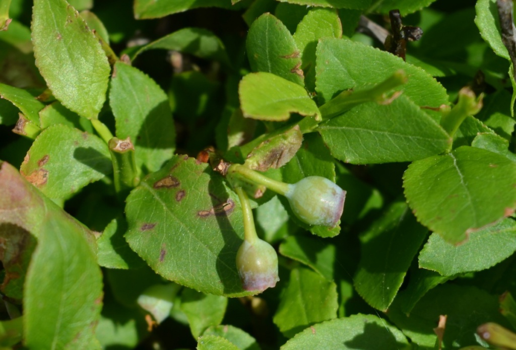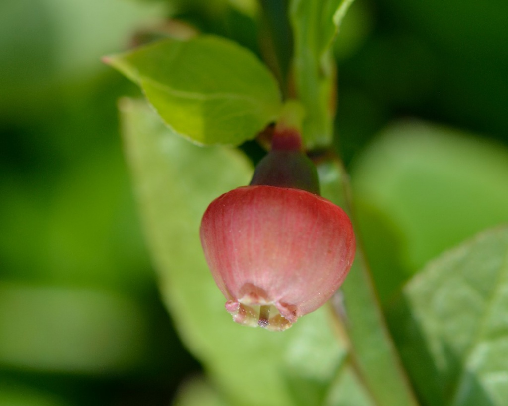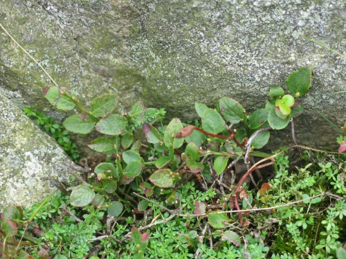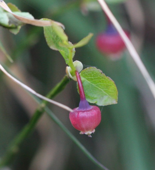 Hairless creeping plant to 60 cm, with several erect stems. Twigs three angled, green. Leaves oval, bright green, toothed and flat. Flowers pale green tinged with pink, lantern shaped 4 to 6 mm, usually solitary. Berry globose, bluish black.