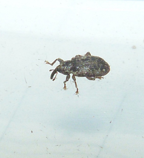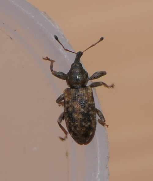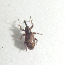 A small weevil with a mottled dark and light brown appearance.