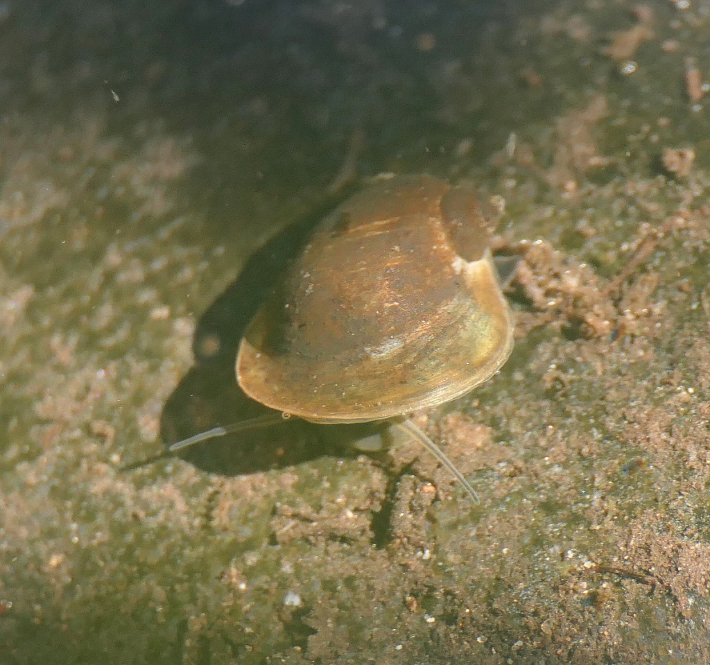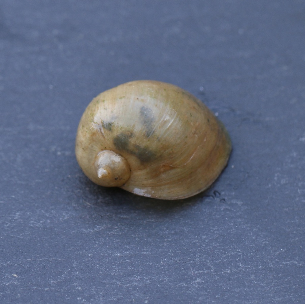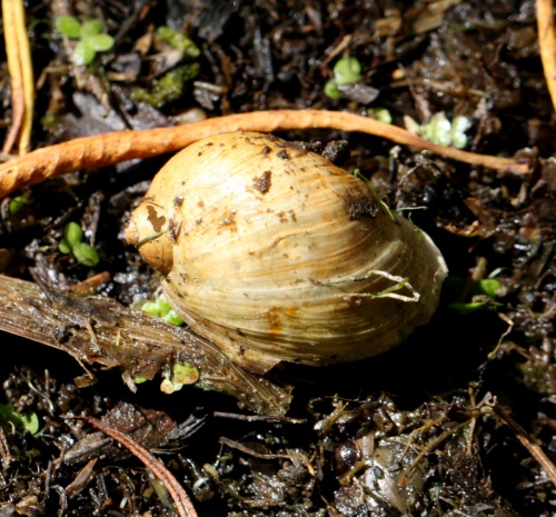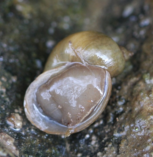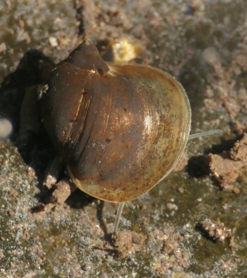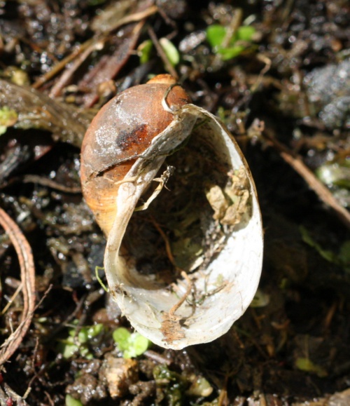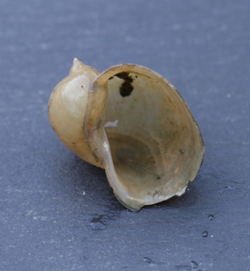 Ampullaceana balthica is very similar but doesn't have such a large, flared mouth. The other good ID feature is the sharp spire in R. auricularia compared to the relatively blunt spire point in A. balthica - a feature that can be felt with the tip of a finger. The angle of the shell forming the top of the mouth is also different, being more or less a right angle in R. auricularia.