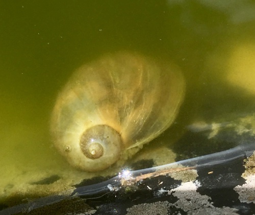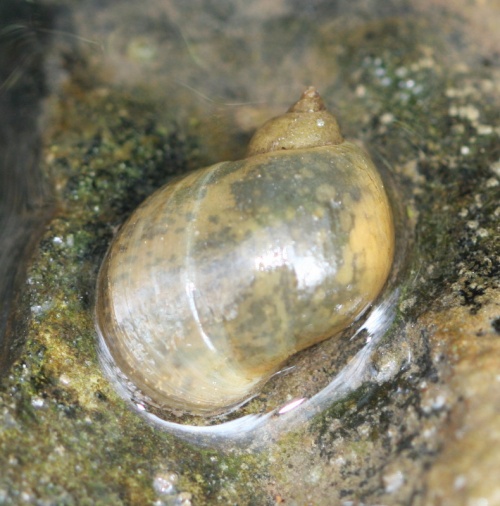 Both snails have a large mouth opening which is more than half the height of the shell. Whilst large specimens of the Ear Pond Snail usually have a flared last whorl which is distinctive, smaller specimens look very similar to the Wandering Snail. However they can be separated by looking at the angle of the aperture lip where it projects from the main shell. In the Ear Pond Snail this is more or less a right angle, whereas in the Wandering Snail it slopes downwards.